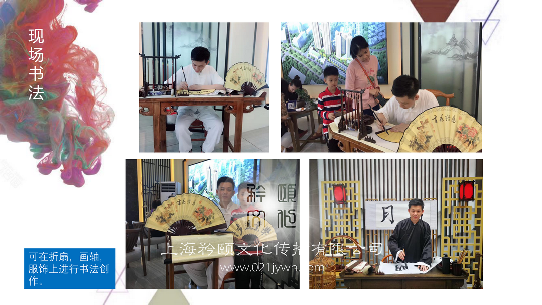 現場書法可在折扇,畫軸,服飾上進行書法創作。
