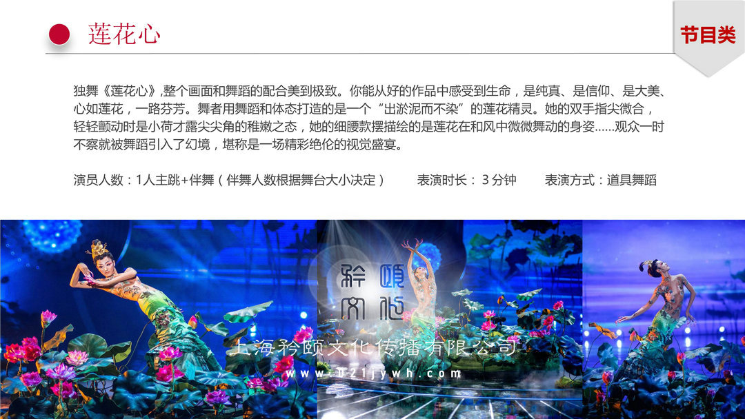 蓮花心節目類:獨舞《蓮花心》,整個畫面和舞蹈的配合美到極致。你能從好的作品中感受到生命,是純真、是信仰、是大美、心如蓮花,一路芬芳。舞者用舞蹈和體態打造的是一個“出淤泥而不染”的蓮花精靈。她的雙手指尖微合,輕輕顫動時是小荷才露尖尖角的稚嫩之態,她的細腰款擺描繪的是蓮花在和風中微微舞動的身姿……觀眾一時不察就被舞蹈引入了幻境,堪稱是一場精彩絕倫的視覺盛宴。