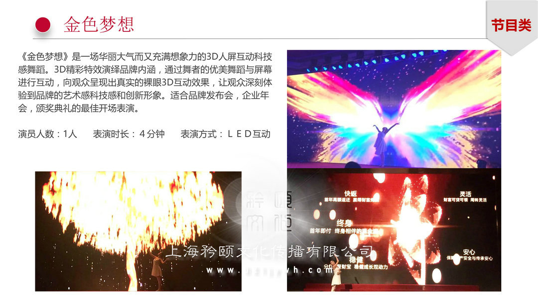 金色夢想節目類:《金色夢想》是一場華麗大氣而又充滿想象力的3D人屏互動科技感舞蹈。3D精彩特效演繹品牌內涵,通過舞者的優美舞蹈與屏幕進行互動,向觀眾呈現出真實的裸眼3D互動效果,讓觀眾深刻體驗到品牌的藝術感科技感和創新形象。適合品牌發布會,企業年會,頒獎典禮的最佳開場表演。