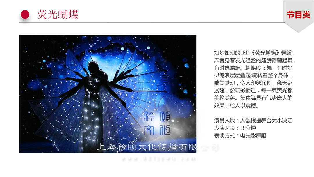 熒光蝴蝶節目類:如夢如幻的LED《熒光蝴蝶》舞蹈。舞者身著發光輕盈的翅膀翩翩起舞,有時像蜻蜓、蝴蝶般飛舞,有時好似海浪層層疊起;旋轉著整個身體,唯美夢幻,令人印象深刻。像天鵝展翅,像瑞彩翩遷,每一束熒光都美輪美奐。集體舞具有氣勢龐大的效果,給人以震撼。