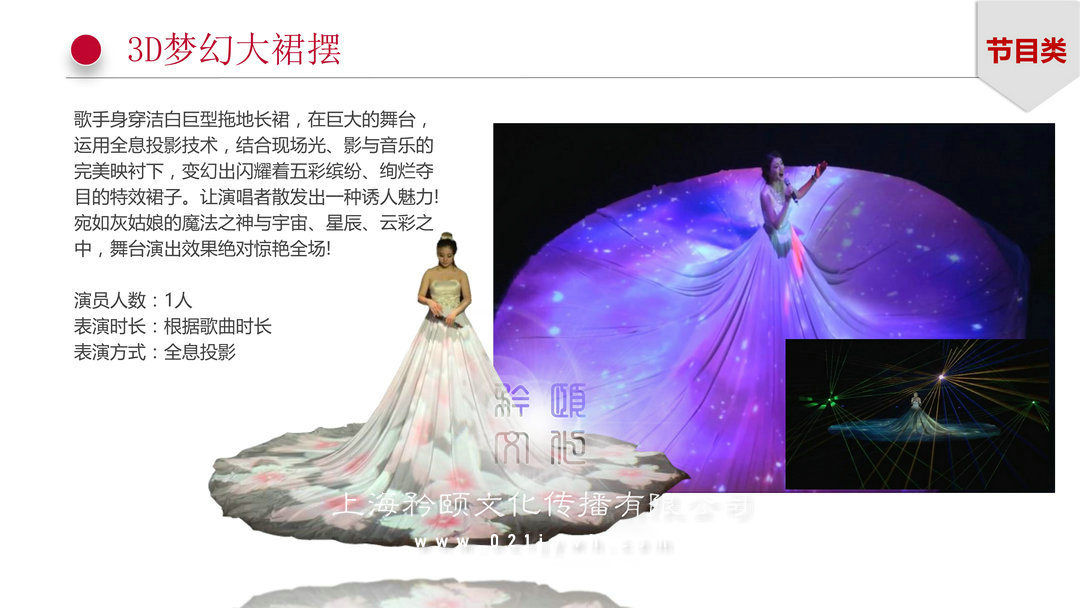 3D夢幻大裙擺節目類:歌手身穿潔白巨型拖地長裙,在巨大的舞臺,運用全息投影技術,結合現場光、影與音樂的完美映襯下,變幻出閃耀著五彩繽紛、絢爛奪目的特效裙子。讓演唱者散發出一種誘人魅力!宛如灰姑娘的魔法之神與宇宙、星辰、云彩之中,舞臺演出效果絕對驚艷全場!