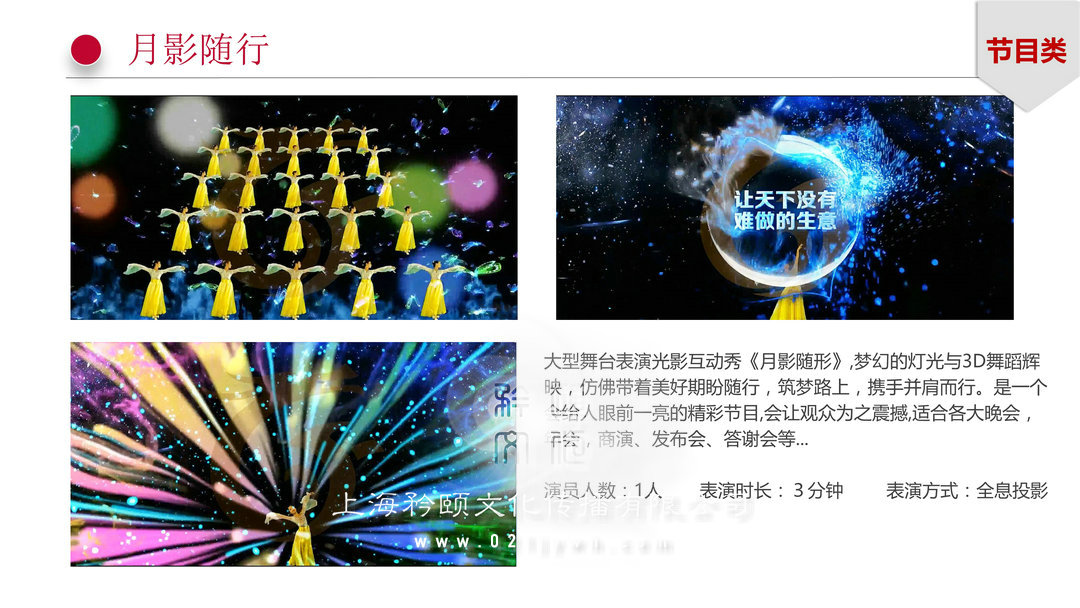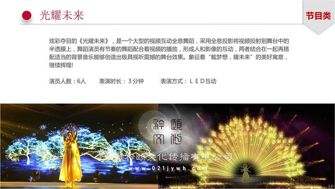 演員人數:人數根據舞臺大小決定表演時長:3分鐘    表演方式:電光影舞蹈