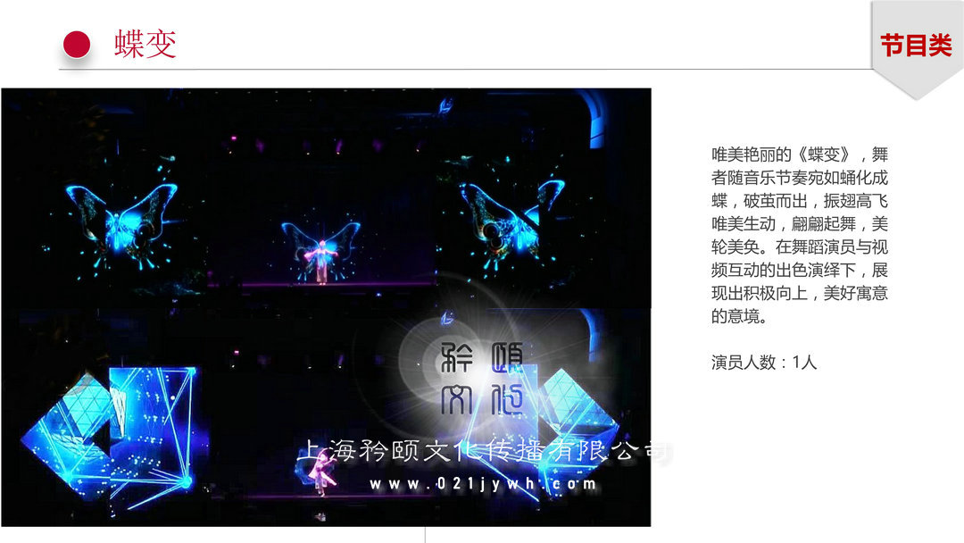 演員人數:1人表演時長:根據歌曲時長   表演方式:全息投影蝶變節目類