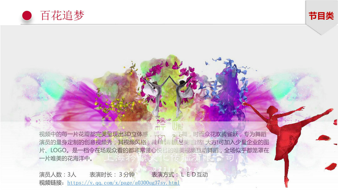 百花追夢節目類:視頻中的每一片花瓣都完美呈現出3D立體感,時而輕盈飛舞,時而眾花歡騰雀躍,專為舞蹈演員的量身定制的創意視頻秀,其視頻風格,簡單!清新!唯美!自然!大方!可加入少量企業的圖片、LOGO。是一檔令在場觀眾看的都非常賞心悅目的唯美視頻互動舞蹈,全場似乎都籠罩在一片唯美的花海洋中。