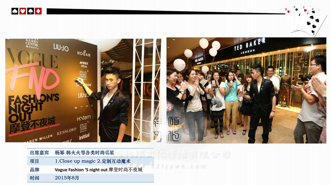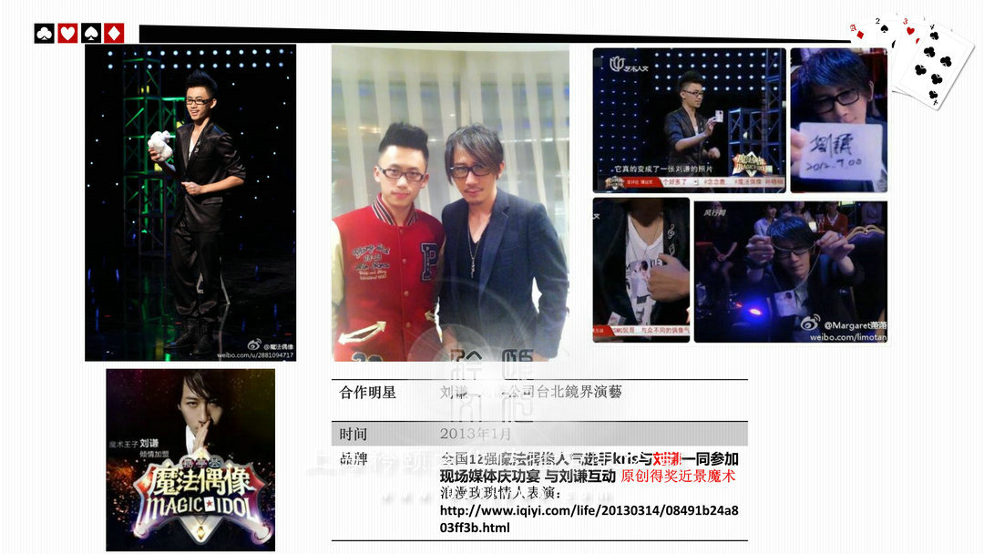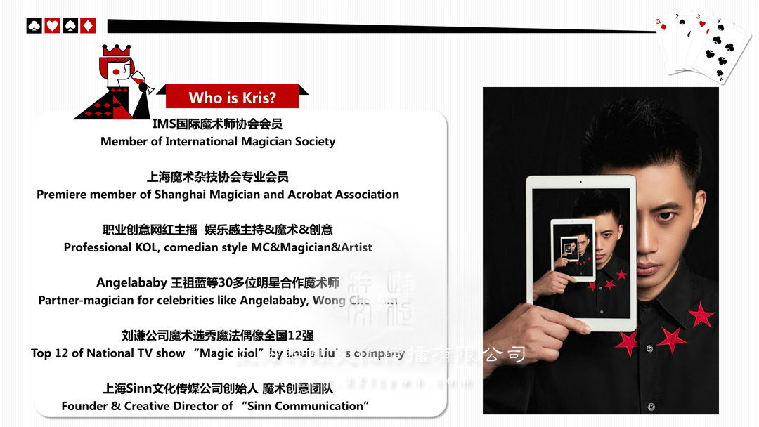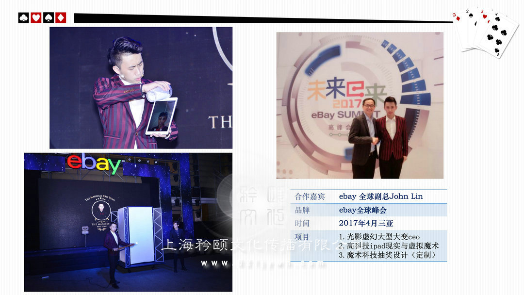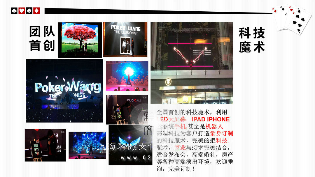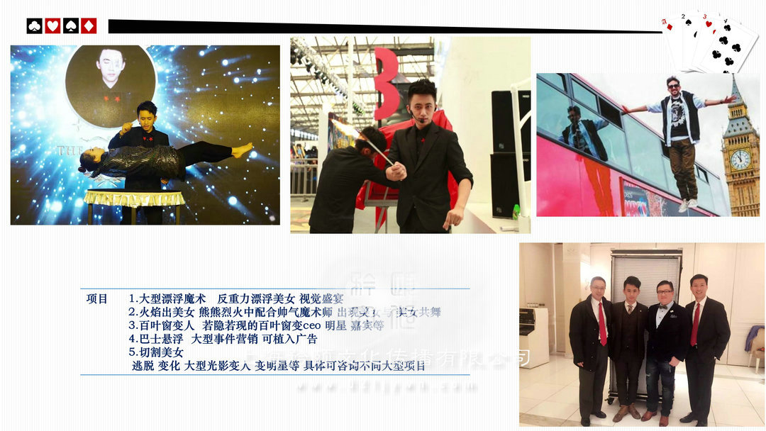 魔術師上海高端私人派對/酒會(high-end personal party)政府或企業大型晚會/比賽(The government or enterprises,big party/game)新聞發布會/時裝發布會/明星見面歌友會/簽約儀式(news release conference)企業年會/剪彩/開盤(Enterprise celebration)企業酒會/慶典(Enterprise cocktail party)新品推廣活動/商品訂貨(Promotion of new activities)各類展覽/展銷(show,exhibition)/拍賣(auction)西式婚禮/中式婚禮/主題婚禮/小孩彌月/壽宴(different weddings)合作明星 Celebrities劉謙,angelababy,趙麗穎,迪麗熱巴,吳尊,王凱,王子文,黃軒,王麗坤,王祖藍,網紅艾克里里,林允,周星馳,小S,林志玲,陳小春,陳柏霖,品冠,水木年華,黃子佼,吳莫愁,劉力揚,戚薇,李云迪,張翰,周冬雨,馬天宇,劉愷威,黃日華等眾多明星 (全部有真實合照和資料)表演足跡曾踏(Host footprints)