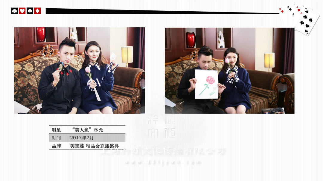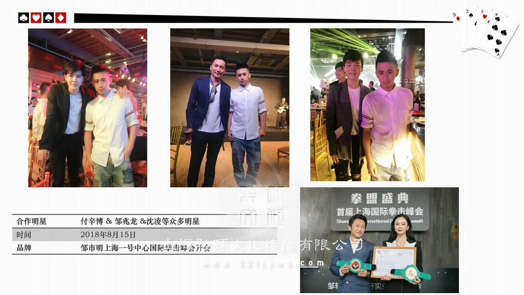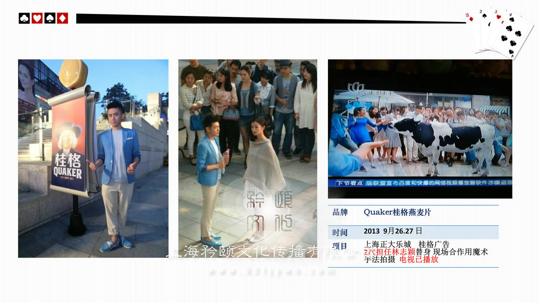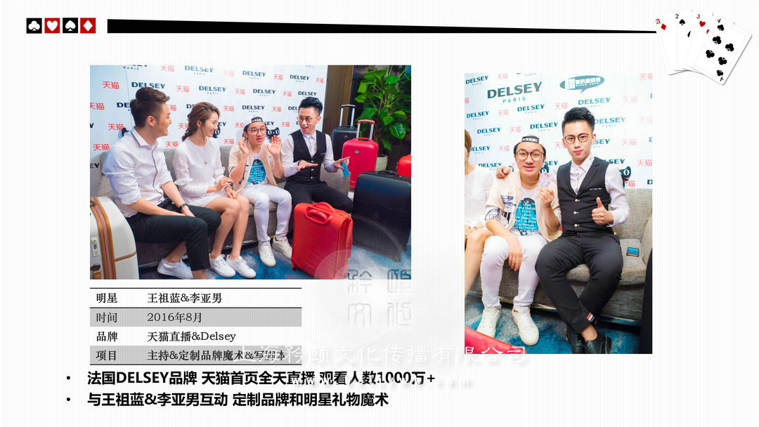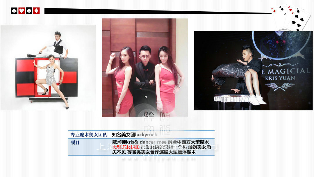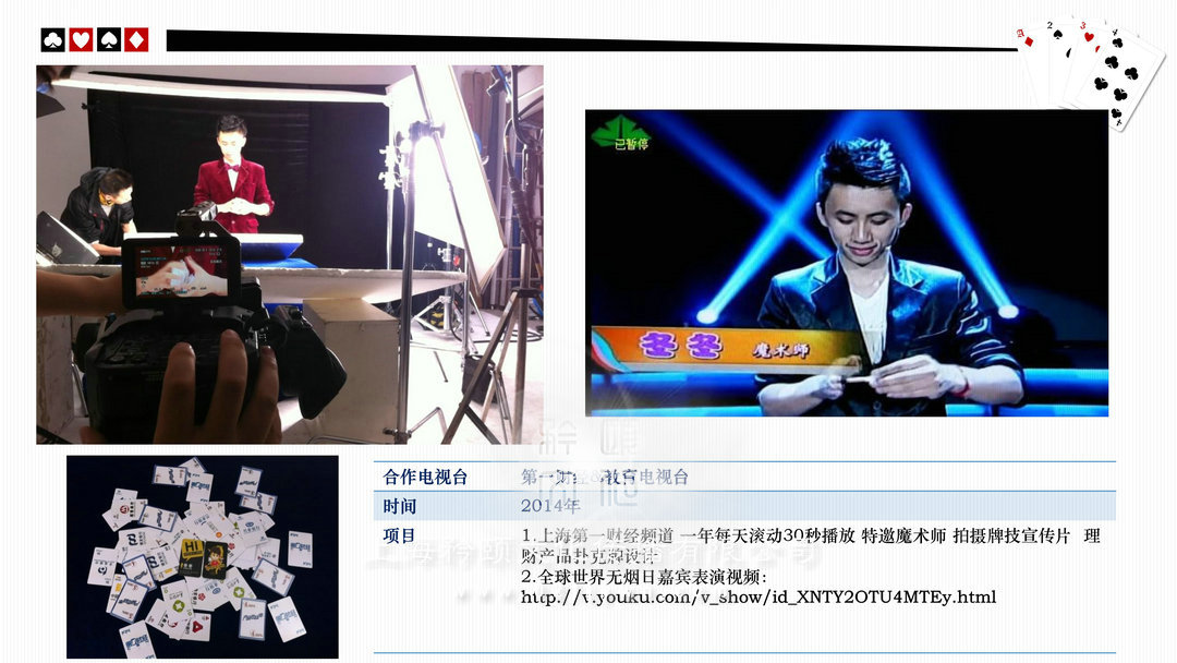 魔術師上海高端私人派對/酒會(high-end personal party)政府或企業大型晚會/比賽(The government or enterprises,big party/game)新聞發布會/時裝發布會/明星見面歌友會/簽約儀式(news release conference)企業年會/剪彩/開盤(Enterprise celebration)企業酒會/慶典(Enterprise cocktail party)新品推廣活動/商品訂貨(Promotion of new activities)各類展覽/展銷(show,exhibition)/拍賣(auction)西式婚禮/中式婚禮/主題婚禮/小孩彌月/壽宴(different weddings)合作明星 Celebrities劉謙,angelababy,趙麗穎,迪麗熱巴,吳尊,王凱,王子文,黃軒,王麗坤,王祖藍,網紅艾克里里,林允,周星馳,小S,林志玲,陳小春,陳柏霖,品冠,水木年華,黃子佼,吳莫愁,劉力揚,戚薇,李云迪,張翰,周冬雨,馬天宇,劉愷威,黃日華等眾多明星 (全部有真實合照和資料)表演足跡曾踏(Host footprints)
