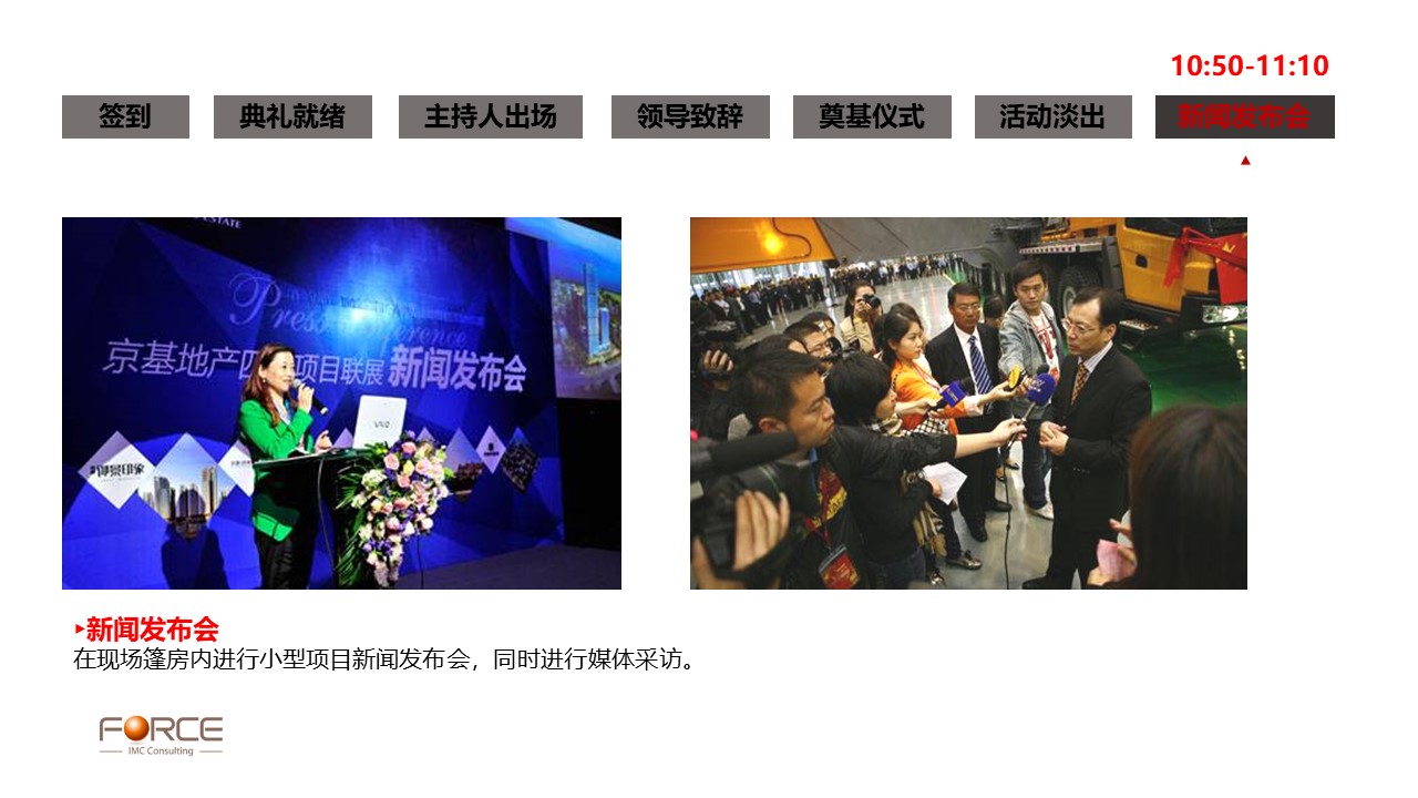 奠基典禮開始前5分鐘,主持人畫外音提醒嘉賓前往典禮區。大屏幕上播放宣傳片。