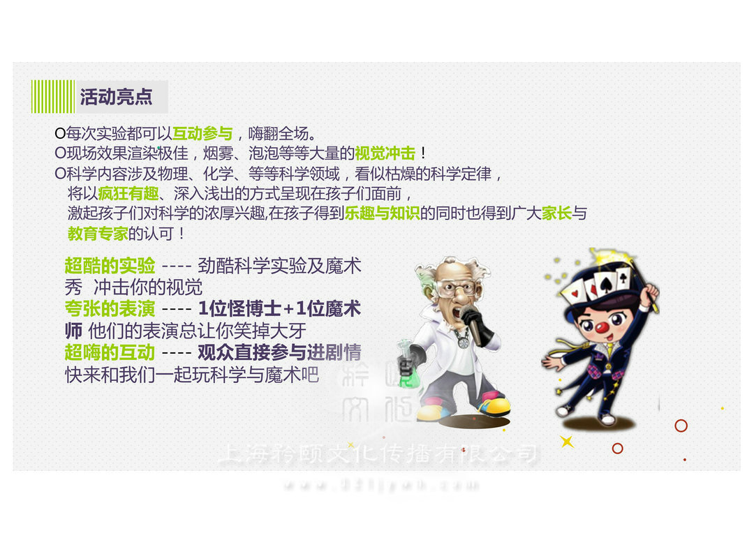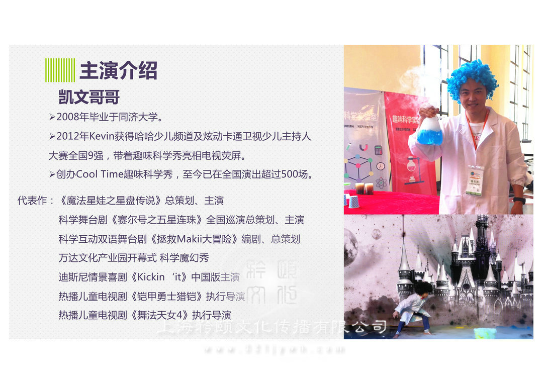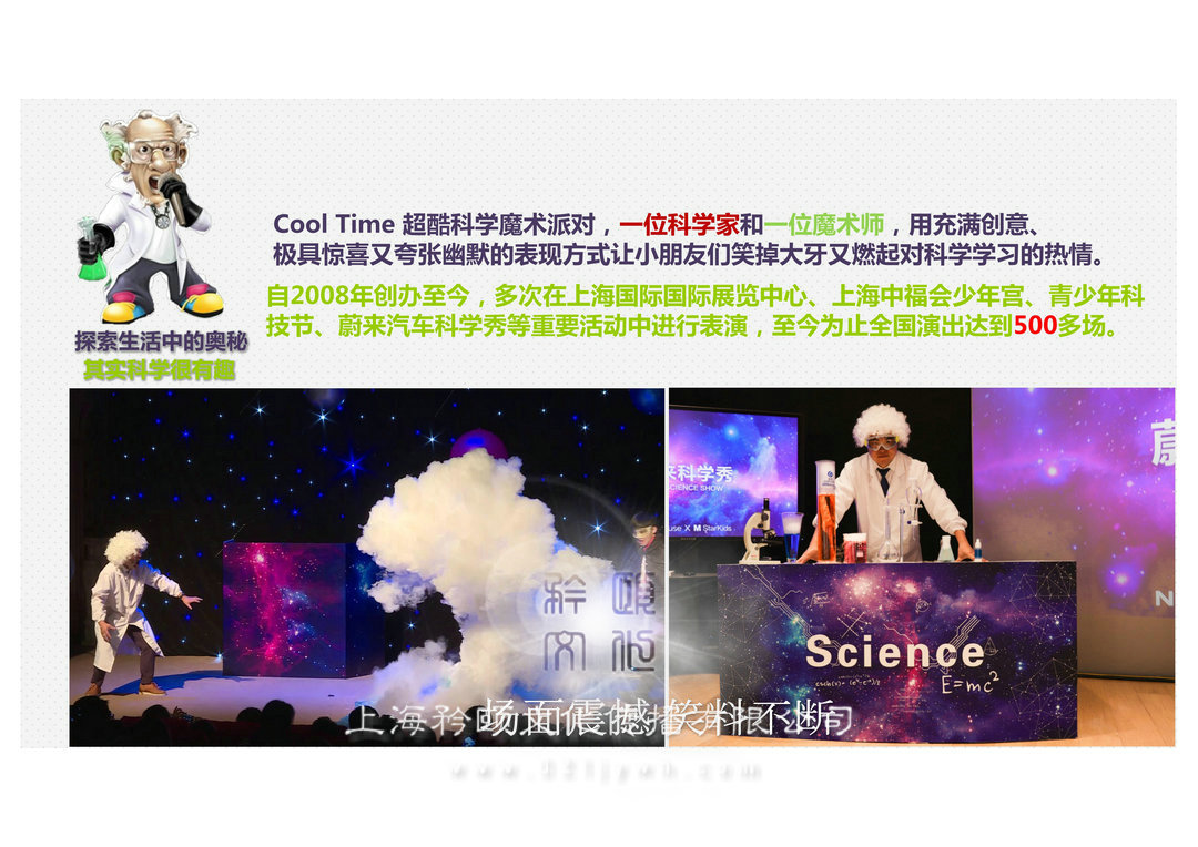 Cool Time 超酷科學魔術派對,一位科學家和一位魔術師,用充滿創意、極具驚喜又夸張幽默的表現方式讓小朋友們笑掉大牙又燃起對科學學習的熱情。自2008年創辦至今,多次在上海國際國際展覽中心、上海中福會少年宮、青少年科技節、蔚來汽車科學秀等重要活動中進行表演,至今為止全國演出達到500多場。