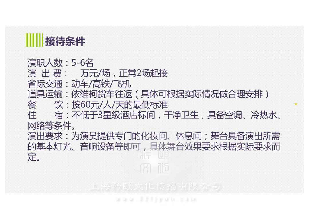 一般合作流程:(1)溝通活動需求,在線客服與客戶確定所需節目及演出時間、地點、演出形式內容等信息,核對演員當期;(2)簽訂演出合同,將商議的演出內容以合同的形式明確;(3)支付定金,在支付完定金后才能將演員檔期預留,因此對于稀缺演出節目,尤其是在活動旺季時一定要先快速支付定金預留節目;(4)活動執行,矜頤專業的活動執行人員在活動前會與您核對演出現場燈光、音響、電源等信息,并提前準備好演出服裝、演出道具、演出背景視頻(音樂)等物料,確保演出完美上演。(5)支付尾款,在活動結束后按照合同約定時間及方式支付演出尾款。(6)客戶滿意度調查,在整個活動演出結束后,矜頤演出售后人員會詢問您對演出的滿意度以及對演出意見等。