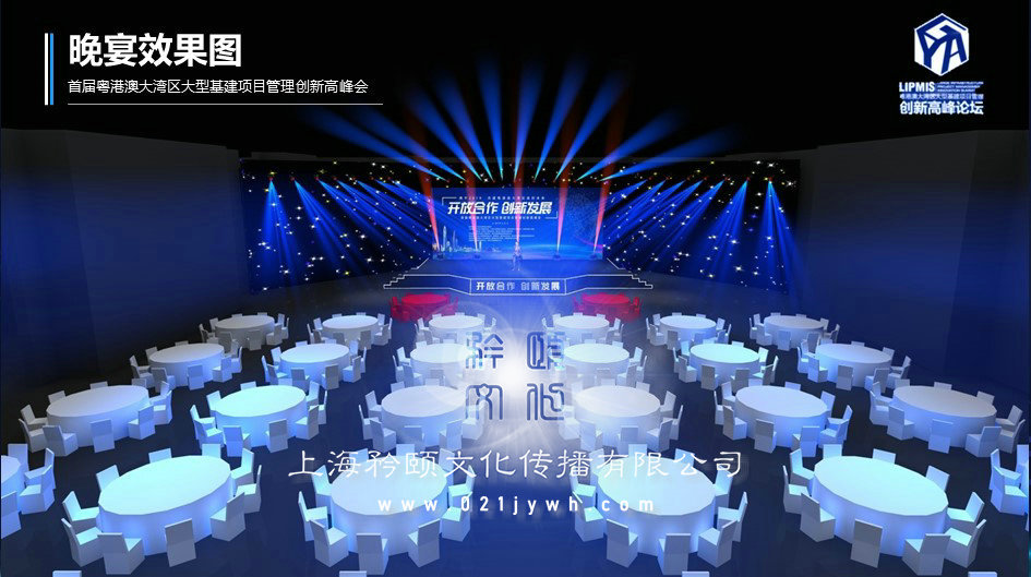 晚宴就緒,大屏幕播放主視覺或暖場視頻;