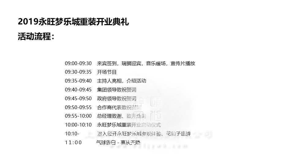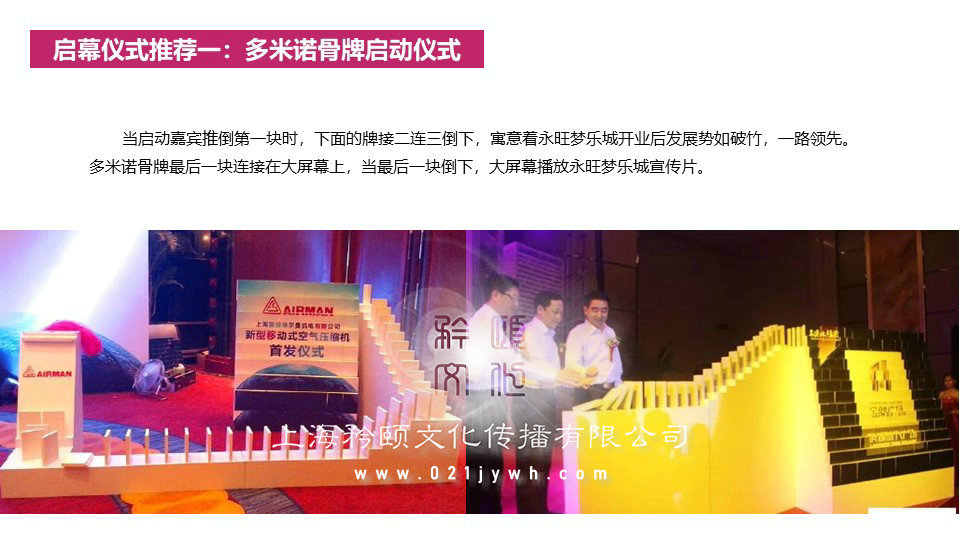 背景板簽到,背景上用鮮花設計主題背景,嘉賓們接過禮儀遞來的筆在上面簽上自己的名字,簽完之后拍照留念。禮儀小姐身穿禮服,引導嘉賓現場簽到,為男、女嘉賓分別佩戴胸花。高樁舞獅迎賓——迎賓通道一側設置高樁舞獅表演吸引人氣及打造喜慶勢氣。播放永旺夢樂城的宣傳片,讓嘉賓進一步了解重新裝修的永旺夢樂城。花是天地靈秀之所鐘,美的化身,賞花,在于悅其姿色而知其神骨,如此方能遨游在每一種花的獨特韻味中,而深得其中情趣。主持人開場,介紹此次活動的主要領導以及活動主題和內容,歡迎廣大嘉賓的到來。領導代表和嘉賓代表進行致辭,闡述對此次開業活動的意義,并且對未來做出展望,最后感謝到場的嘉賓。當啟動嘉賓推倒第一塊時,下面的牌接二連三倒下,寓意著永旺夢樂城開業后發展勢如破竹,一路領先。多米諾骨牌最后一塊連接在大屏幕上,當最后一塊倒下,大屏幕播放永旺夢樂城宣傳片。定制“永旺夢樂城”字樣造型透明模型,領導共同灌注彩色液體,開啟重裝開業繽紛時尚購物新篇章。領導們在舞臺上共同剪彩,大門開啟,有所謂“開業大吉鴻運來,業績功成招福財,大吉興旺財源進,吉開貴門富如海”的美好寓意。儀式結束之后,領導、嘉賓在禮儀的引導下到商場內進行參觀,由專業人士講解商場格局、功能等。儀式結束后祥獅跟隨領導商場巡游,在主力店門前表演助興。