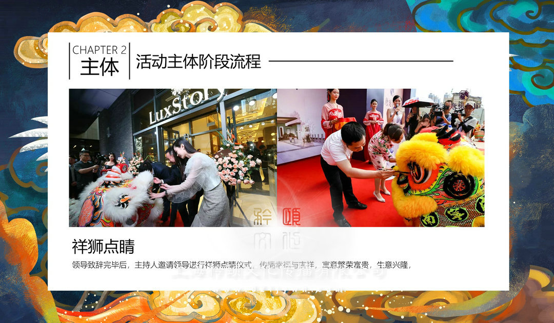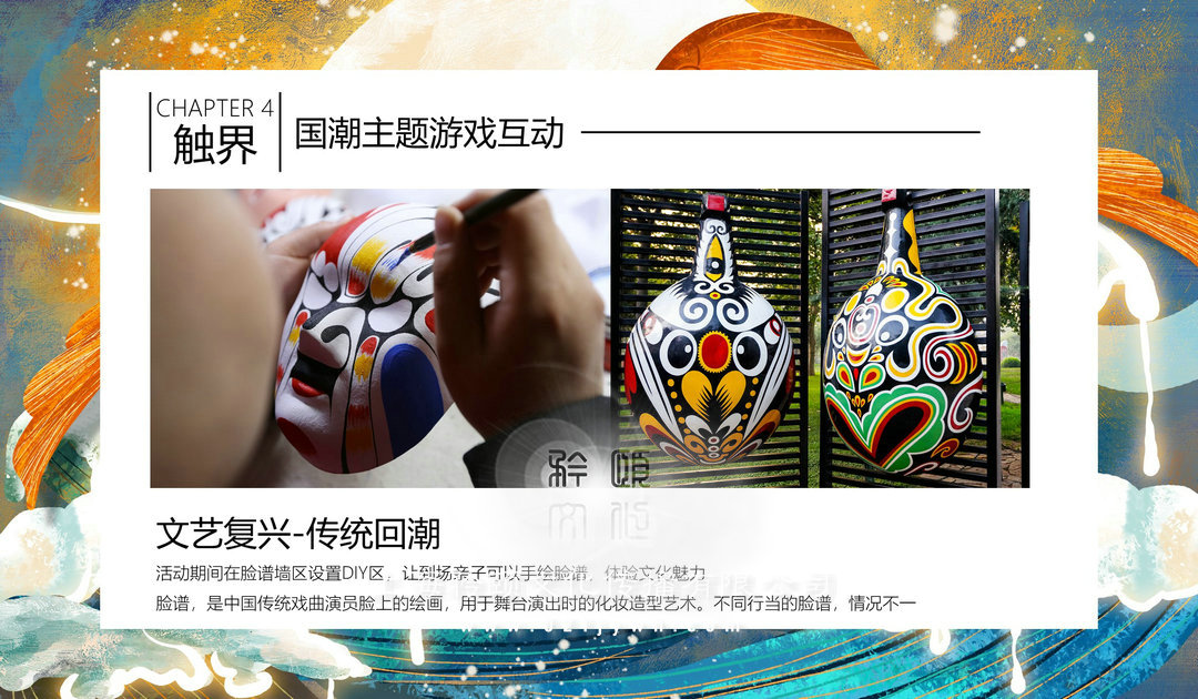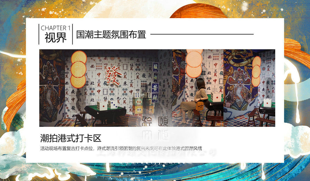活動內容:在國潮文化節啟幕儀式上,古典文化與現代流行元素上演精彩絕倫的跨界混搭:中國國粹京劇與西方的自由樂派嘻哈相遇,奉上了嘆為觀止的嘻哈京劇開場表演;結合了街舞與電音的吉祥舞獅熱鬧登場。啟幕環節以金沙題寫的匾額為創意,呼應了古時皇帝御筆題匾、懸于門上的儀式感。匾額的題寫標志著開業慶典策劃暨國潮文化節正式啟幕。