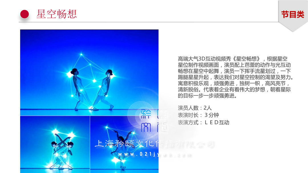 星空暢想節目類:高端大氣3D互動視頻秀《星空暢想》,根據星空星位制作視頻畫面,演員配上芭蕾的動作與光互動暢想在星空中起舞,演員一下揮手流星劃過,一下踢腿星星升起,表達我們對星空控制的渴望及努力。寓意積極樂觀,頑強勇進,獨樹一幟,高風亮節,清新脫俗。代表著企業有著偉大的夢想,朝著星際的目標一步一步頑強勇進。