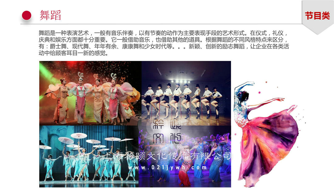 舞蹈節目類:舞蹈是一種表演藝術,一般有音樂伴奏,以有節奏的動作為主要表現手段的藝術形式。在儀式,禮儀,慶典和娛樂方面都十分重要。它一般借助音樂,也借助其他的道具。根據蹈的不同風格特點來區分,有:爵士舞、現代舞、年年有余、康康舞和少女時代等。。。新穎、創新的勵志舞蹈,讓企業在各類活動中給顧客耳目一新的感覺。