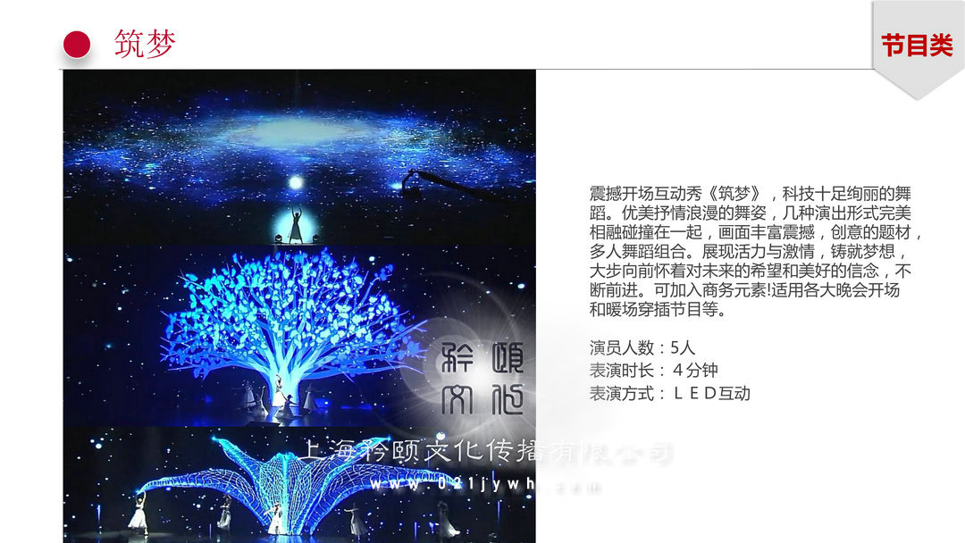 筑夢節目類:震撼開場互動秀《筑夢》,科技十足絢麗的舞蹈。優美抒情浪漫的舞姿,幾種演出形式完美相融碰撞在一起,畫面豐富震撼,創意的題材,多人舞蹈組合。展現活力與激情,鑄就夢想,大步向前懷著對未來的希望和美好的信念,不斷前進。可加入商務元素!適用各大晚會開場和暖場穿插節目等。