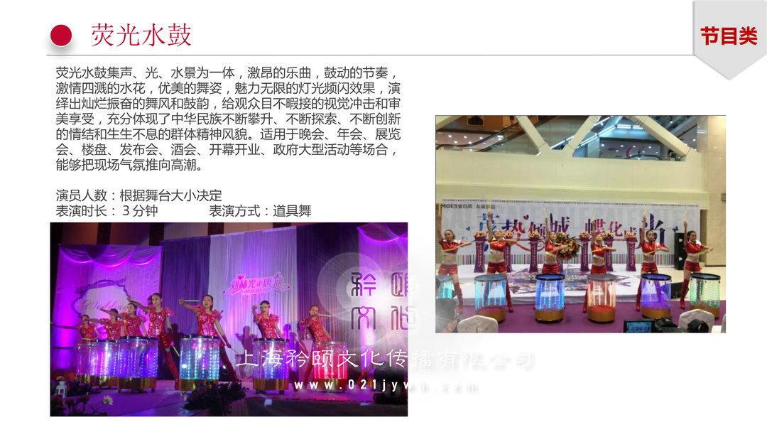 熒光水鼓節目類:熒光水鼓集聲、光、水景為一體,激昂的樂曲,鼓動的節奏,激情四濺的水花,優美的舞姿,魅力無限的燈光頻閃效果,演繹出燦爛振奮的舞風和鼓韻,給觀眾目不暇接的視覺沖擊和審美享受,充分體現了中華民族不斷攀升、不斷探索、不斷創新的情結和生生不息的群體精神風貌。適用于晚會、年會、展覽會、樓盤、發布會、酒會、開幕開業、政府大型活動等場合,能夠把現場氣氛推向高潮。