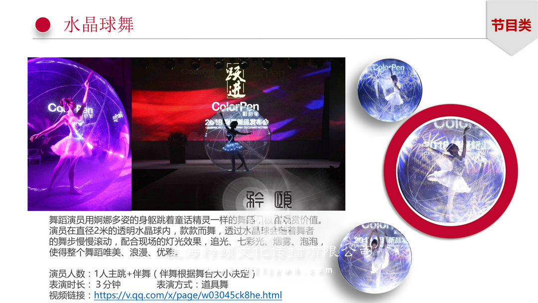 水晶球舞節目類:舞蹈演員用婀娜多姿的身軀跳著童話精靈一樣的舞蹈,極富觀賞價值。演員在直徑2米的透明水晶球內,款款而舞,透過水晶球會隨著舞者的舞步慢慢滾動,配合現場的燈光效果,追光、七彩光、煙霧、泡泡,使得整個舞蹈唯美、浪漫、優雅。