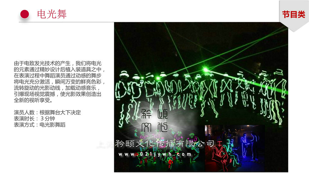 演員人數:根據舞臺大下決定表演時長:3分鐘    表演方式:電光影舞蹈