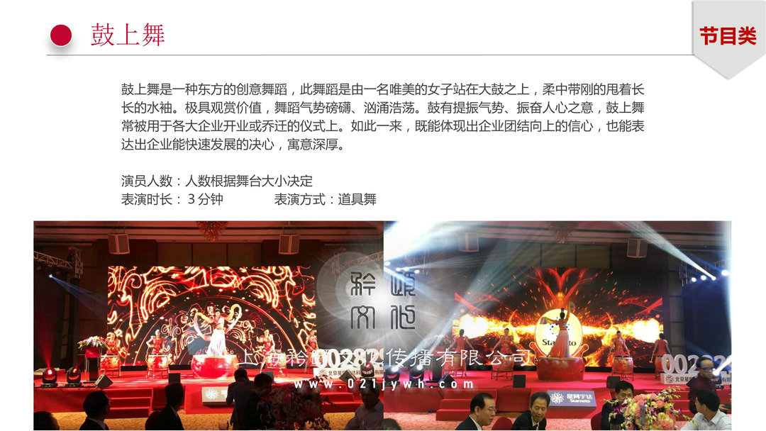 鼓上舞節目類:鼓上舞是一種東方的創意舞蹈,此舞蹈是由一名唯美的女子站在大鼓之上,柔中帶剛的甩著長長的水袖。極具觀賞價值,舞蹈氣勢磅礴、洶涌浩蕩。鼓有提振氣勢、振奮人心之意,鼓上舞常被用于各大企業開業或喬遷的儀式上。如此一來,既能體現出企業團結向上的信心,也能表達出企業能快速發展的決心,寓意深厚。