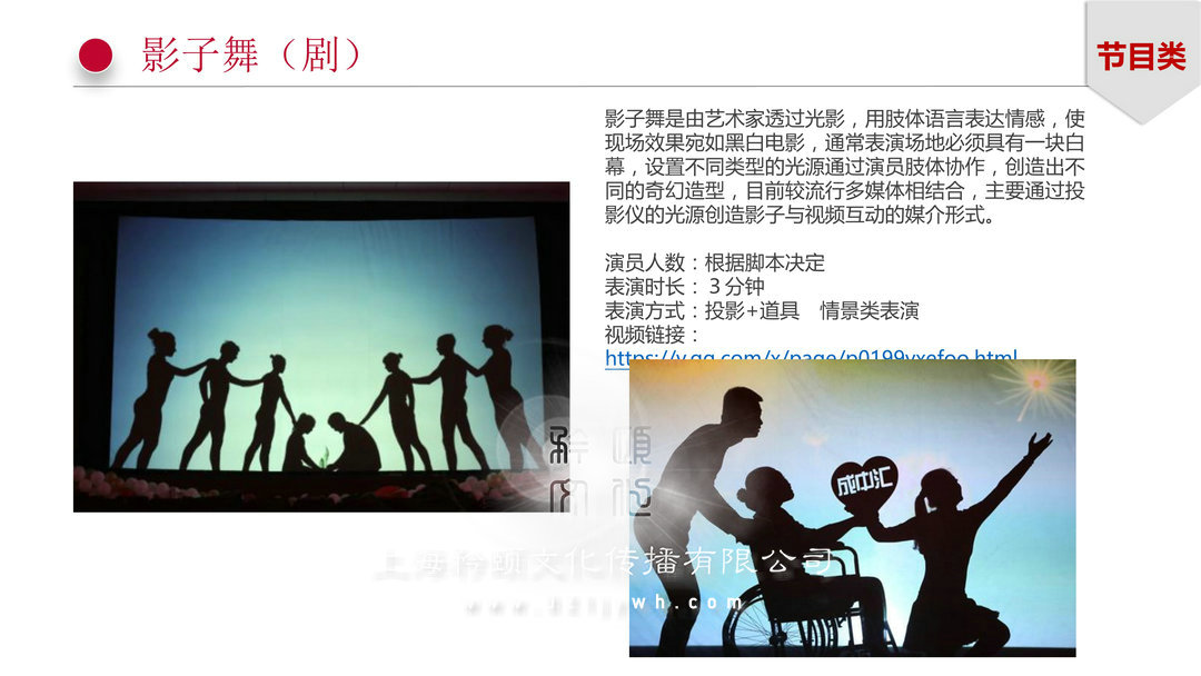 演員人數:根據腳本決定(建議8人)表演時長:5分鐘    表演方式:投影+道具 情景類表演