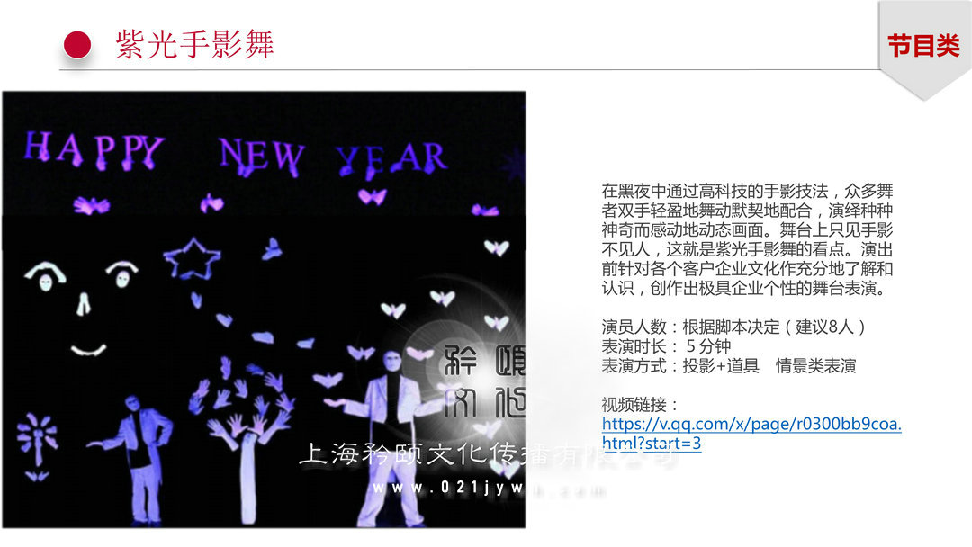 紫光手影舞節目類:在黑夜中通過高科技的手影技法,眾多舞者雙手輕盈地舞動默契地配合,演繹種種神奇而感動地動態畫面。舞臺上只見手影不見人,這就是紫光手影舞的看點。演出前針對各個客戶企業文化作充分地了解和認識,創作出極具企業個性的舞臺表演。