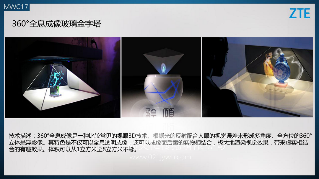 技術描述:360°全息投影成像是一種比較常見的裸眼技術。根據光的反射配合人眼的規覺誤差來形成多角度、全方位的360°全息投影