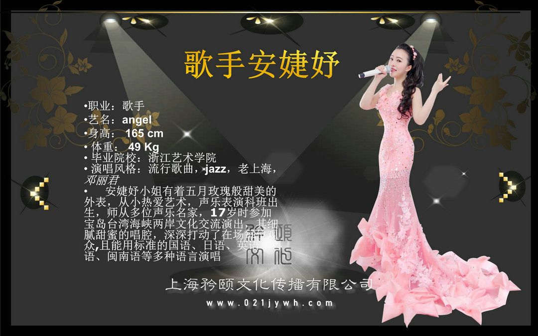 •職業:歌手•藝名:angel•身高:165cm•體重:49Kg•畢業院校:浙江藝術學院•演唱風格:流行歌曲,jazz,老上海,鄧麗君