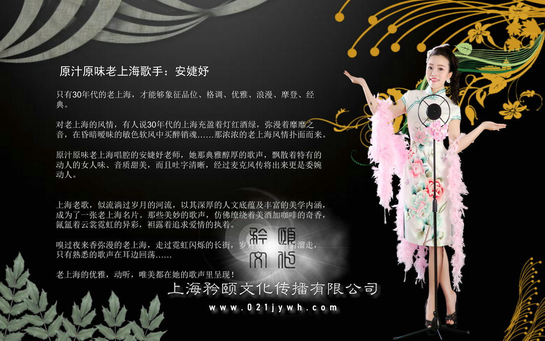 •老上海歌手鄧麗君模仿者有著五月玫瑰般甜美的外表,從小熱愛藝術,聲樂表演科班出生,師從多位聲樂名家,17歲時參加寶島臺灣海峽兩岸文化交流演出,其細膩甜蜜的唱腔,深深打動了在場每位觀眾,且能用標準的國語、日語、英語、粵語、閩南語等多種語言演唱安婕妤對周璇、白光姚莉等老上海歌后的作品十分擅唱,成功舉辦過數場個人上海老歌獨唱音樂會,2015年受邀參加--上海國際藝術節專場經典老上海歌曲演出,她娓娓動聽的歌聲成為了在老上海觀眾眼中優秀的上海灘金曲代言人原汁原味老上海歌手