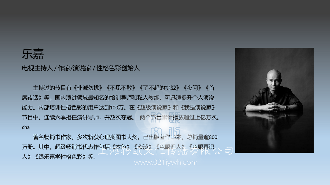 主持過的節目有《非誠勿擾》《不見不散》《了不起的挑戰》《夜問》《首 席夜話》等。國內演講領域最知名的培訓導師和私人教練,可迅速提升個人演說 能力。內部培訓性格色彩的用戶達到100萬。在《超級演說家》和《我是演說家》 節目中,連續六季擔任演講導師,并數次奪冠。  兩個節目累計播放超過上億萬次。 cha         著名暢銷書作家,多次斬獲心理類圖書大獎。已出版著作13本,總銷量逾800 萬冊。其中,超級暢銷書代表作包括《本色》《淡淡》《色眼識人》《色眼再識 人》《跟樂嘉學性格色彩》等。