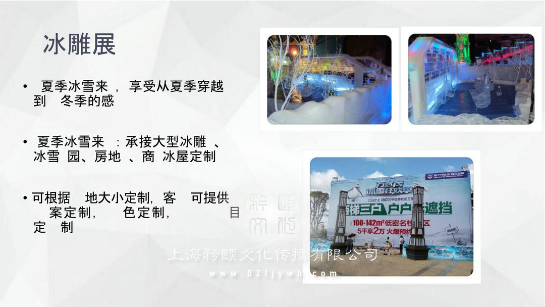 冰雕展•夏季冰雪來 ,享受從夏季穿越到冬季的感 •夏季冰雪來 :承接大型冰雕 、冰雪 園、房地 、商 冰屋定制•可根據 地大小定制,客 可提供 案定制, 色定制, 目定制LED光雕展品•各 光雕展品, 物、圣 老人、雪人、 光 等等
