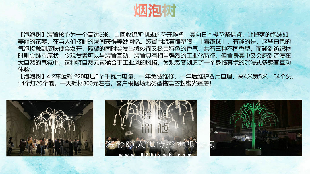 【泡泡樹(shù)】4.2車運(yùn)輸.220電壓5個(gè)千瓦用電量,一年免費(fèi)維修,一年后維護(hù)費(fèi)用自理,高4米寬5米,34個(gè)頭,14個(gè)燈20個(gè)泡,一天耗材300元左右,客戶根據(jù)場(chǎng)地類型搭建密封蜜光蓬房!