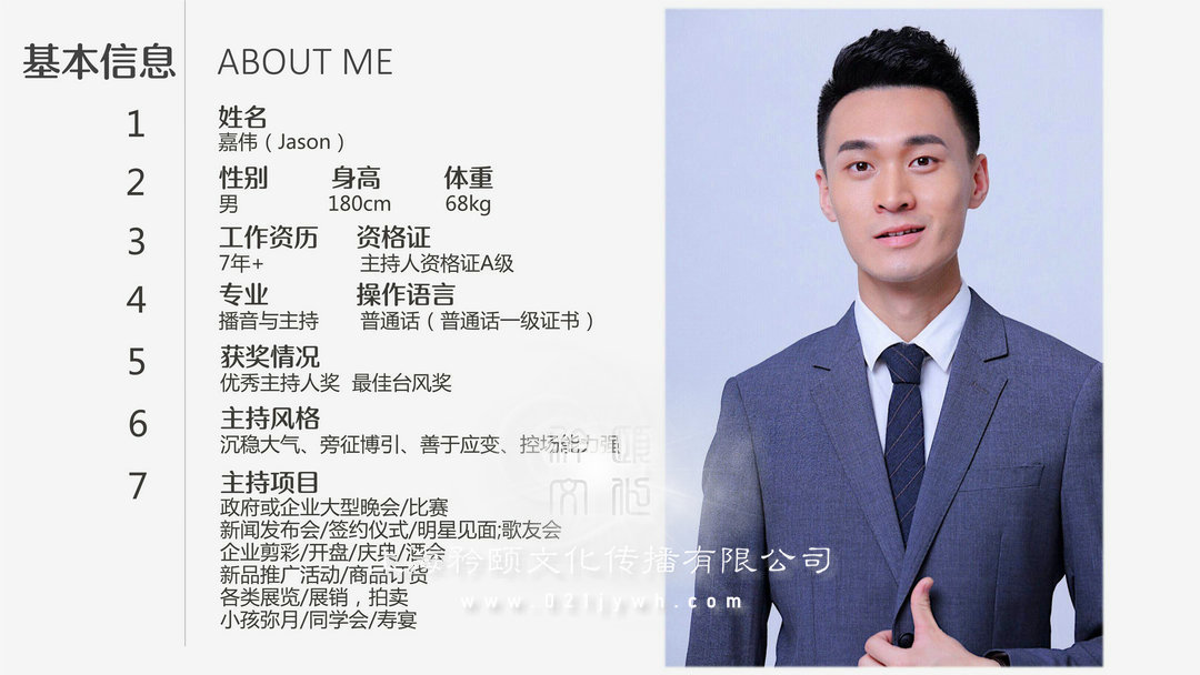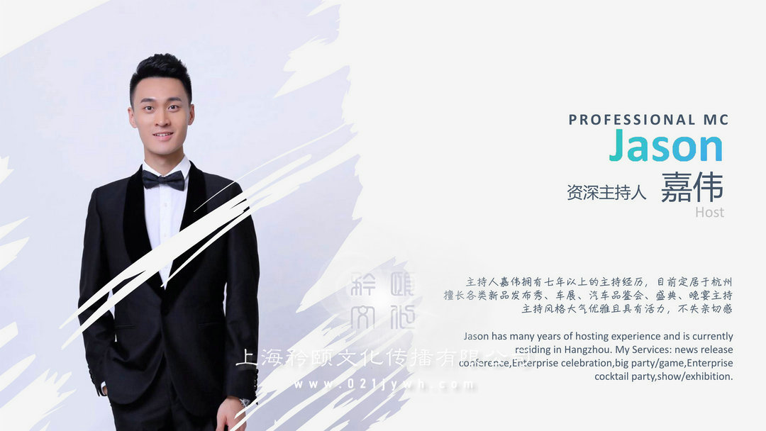 上海的主持人擁有七年以上的主持經歷,目前定居于杭州擅長各類新品發布秀、車展、汽車品鑒會、盛典、晚宴主持,主持風格大氣優雅且具有活力,不失親切感