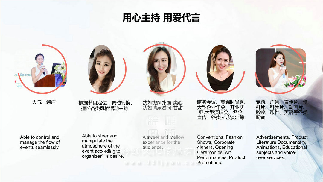 身高:165cm體重:46kg年齡:28經驗:9年普通話水平:一級甲等畢業院校:上海電影藝術學院主持與播音專業會展主持實務導師