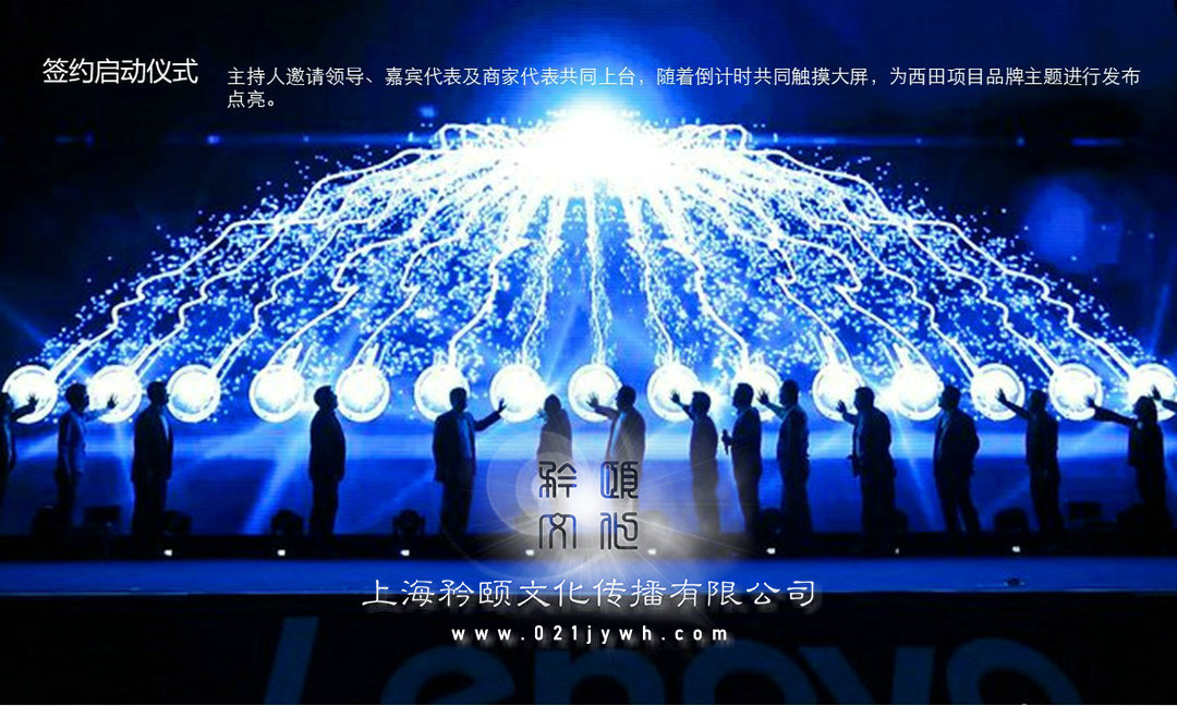 主持人邀請領導、嘉賓代表及商家代表共同上臺,隨著倒計時共同觸摸大屏,為上海xx項目品牌主題進行發布點亮。