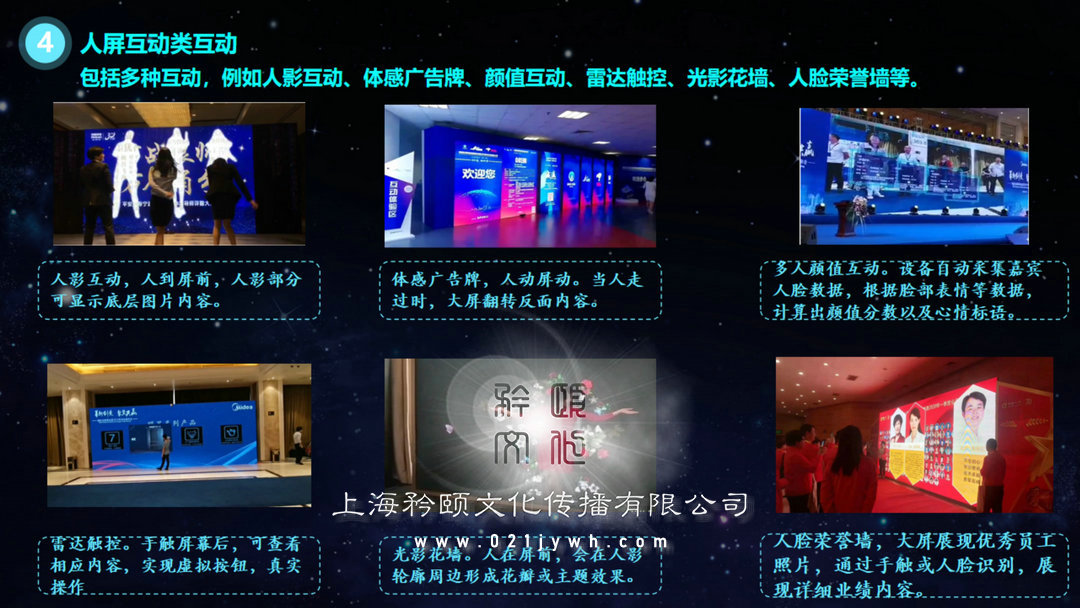 人屏互動類互動,包括多種互動,例如人影互動、體感廣告牌、顏值互動、雷達觸控、光影花墻、人臉榮譽墻等。