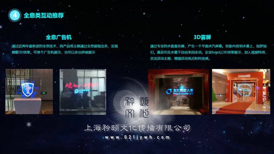 3D霧屏,通過專業的水霧霧化器,產生一一個平面水氵氣屏幕。投影內容到水幕上,如夢如幻。嘉賓可在水幕下自由來回走動。企業|ogo以3D效果展示,加入視頻特效突出活動主題,增強活動點和科技感。
