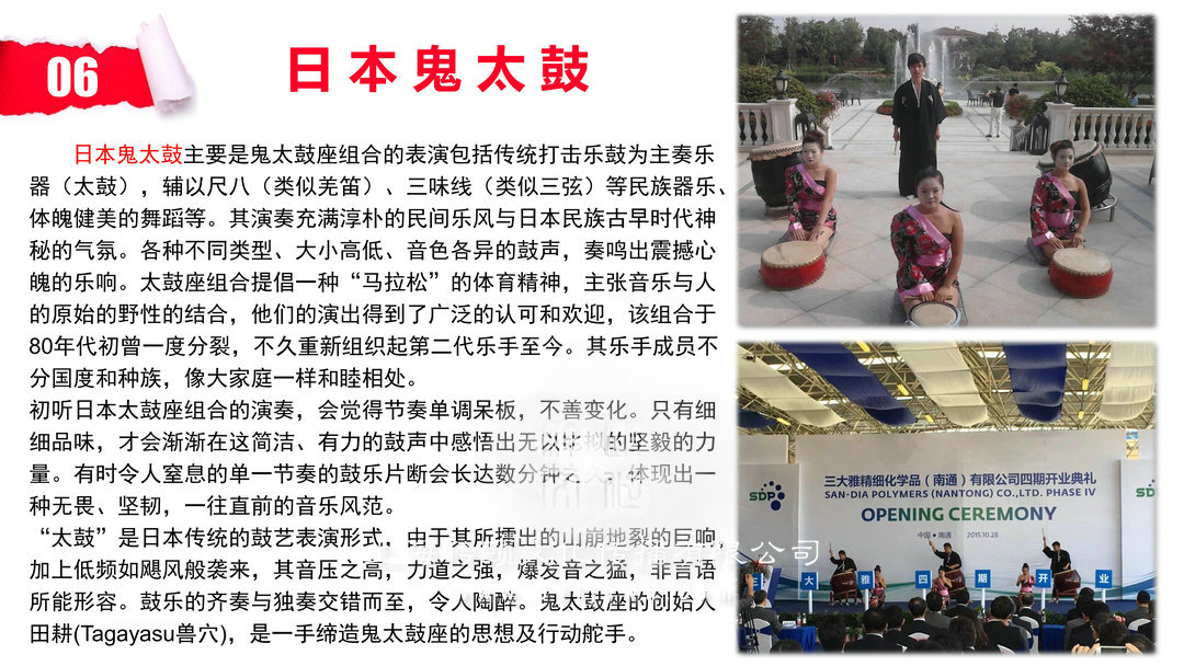 日本鬼太鼓主要是鬼太鼓座組合的表演包括傳統(tǒng)打擊樂(lè)鼓為主奏樂(lè)器(太鼓),輔以尺八(類(lèi)似羌笛)、三味線(類(lèi)似三弦)等民族器樂(lè)、體魄健美的舞蹈等。其演奏充滿(mǎn)淳樸的民間樂(lè)風(fēng)與日本民族古早時(shí)代神秘的氣氛。各種不同類(lèi)型、大小高低、音色各異的鼓聲,奏鳴出震撼心魄的樂(lè)響。太鼓座組合提倡一種“馬拉松”的體育精神,主張音樂(lè)與人的原始的野性的結(jié)合,他們的演出得到了廣泛的認(rèn)可和歡迎,該組合于