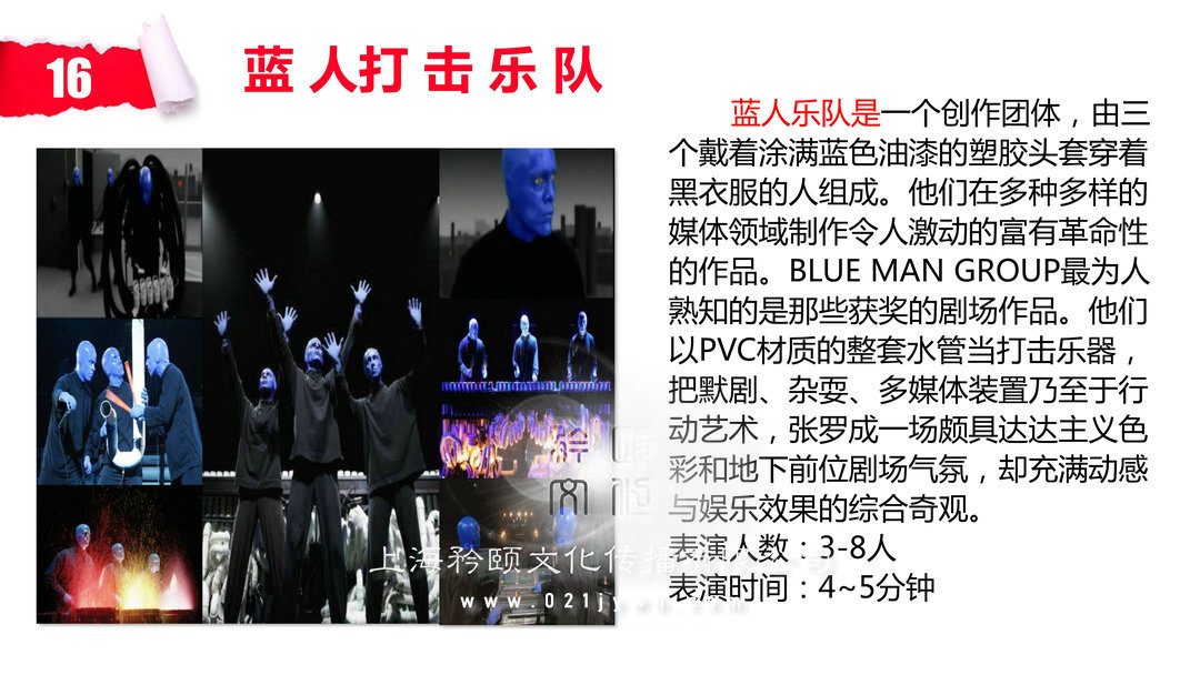 藍(lán)人樂(lè)隊(duì)是一個(gè)創(chuàng)作團(tuán)體,由三個(gè)戴著涂滿(mǎn)藍(lán)色油漆的塑膠頭套穿著黑衣服的人組成。他們?cè)诙喾N多樣的媒體領(lǐng)域制作令人激動(dòng)的富有革命性的作品。BLUE MAN GROUP最為人熟知的是那些獲獎(jiǎng)的劇場(chǎng)作品。他們以PVC材質(zhì)的整套水管當(dāng)打擊樂(lè)器,把默劇、雜耍、多媒體裝置乃至于行動(dòng)藝術(shù),張羅成一場(chǎng)頗具達(dá)達(dá)主義色彩和地下前位劇場(chǎng)氣氛,卻充滿(mǎn)動(dòng)感與娛樂(lè)效果的綜合奇觀。