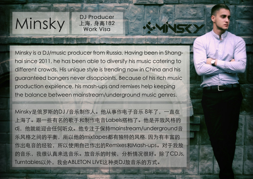 Minsky是俄羅斯的DJ/音樂制作人。他從事作電子音樂8年了,一直在上海了。跟一些有名的歌手和制作電音Labe》s搭檔了。他是開放風格的dj,他就能迎合任何聽眾。他專注于保持mainstream/underg℃und音樂風格之間的平衡,所以他的mixtapes都有獨特的風格·因為有豐富的作出電音的經(jīng)驗,所以使用自己作出的Remixes和Mash-upso對于我放