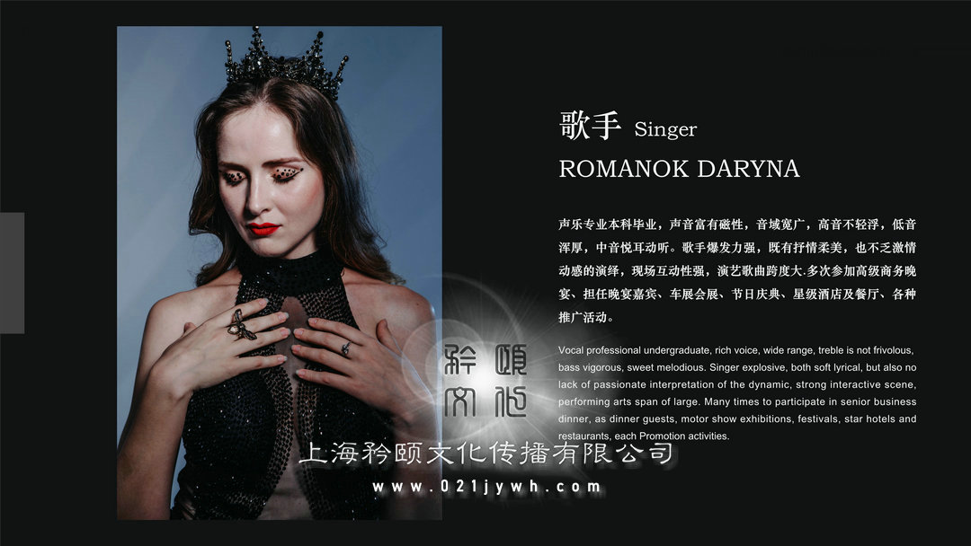 樂隊女主唱:聲樂專業本科畢業,聲音富有磁性,音域寬廣,高音不輕浮,低音渾厚,中音悅耳動聽。歌手爆發力強,既有抒情柔美,也不乏激情動感的演繹,現場互動性強,演藝歌曲跨度大.多次參加高級商務晚宴、擔任晚宴嘉賓、車展會展、節日慶典、星級酒店及餐廳、各種推廣活動。