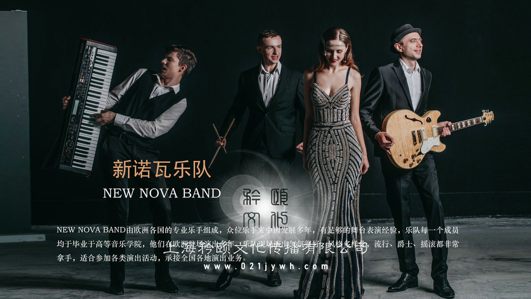 NEWNOVABAND由歐洲各國的專業樂手組成,眾位樂手來中國發展多年,有足夠的舞臺表演經驗,樂隊每一個成員均于畢業于高等音樂學院,他們在歐洲駐場演出多年。樂隊現場演出氣氛很好,風格多樣化,流行、爵士、搖滾都非常拿手,適合參加各類演出活動,承接全國各地演出業務。