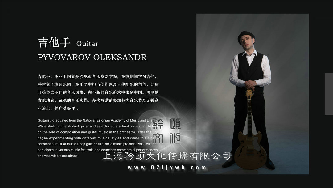 外籍吉他手:畢業于國立愛沙尼亞音樂戲劇學院,在校期間學習吉他,并建立了校園樂團,在樂團中擔當創作以及吉他配樂的角色,此后開始嘗試不同的音樂風格,在不斷的音樂追求中來到中國。深厚的吉他功底,沉穩的音樂實操,多次被邀請參加各類音樂節及無數商業演出,并廣受好評