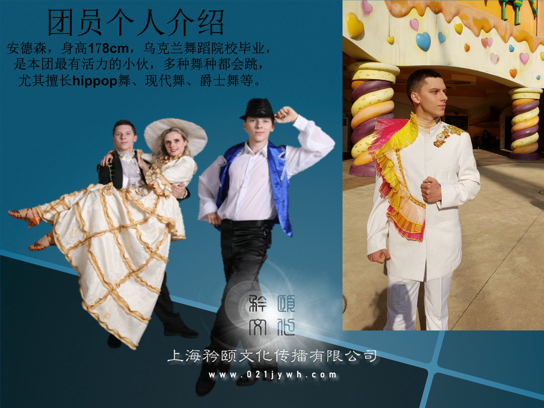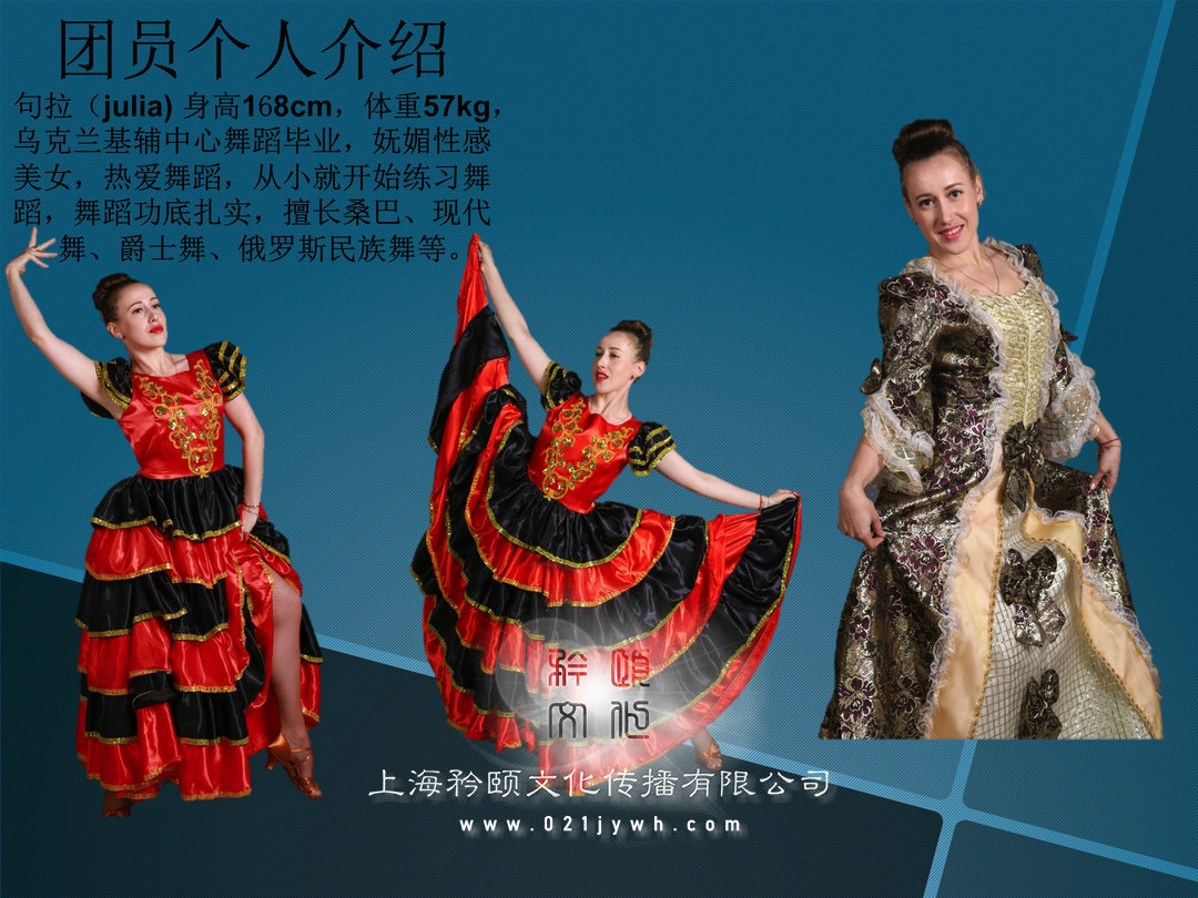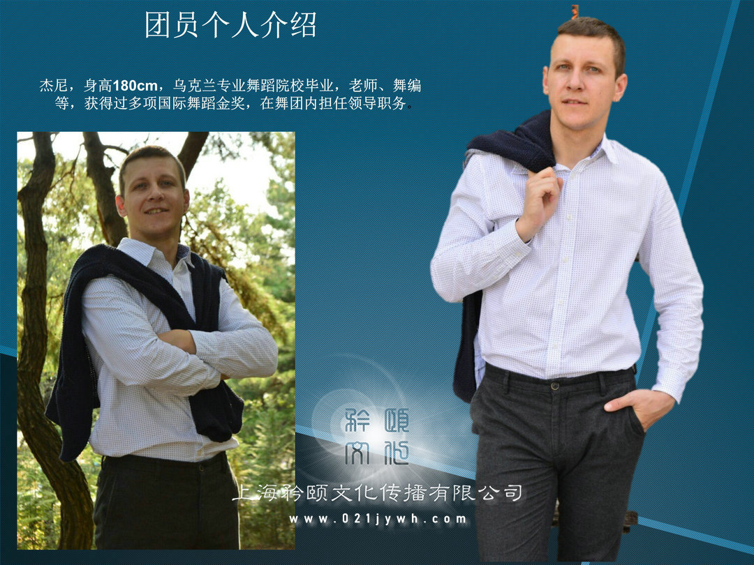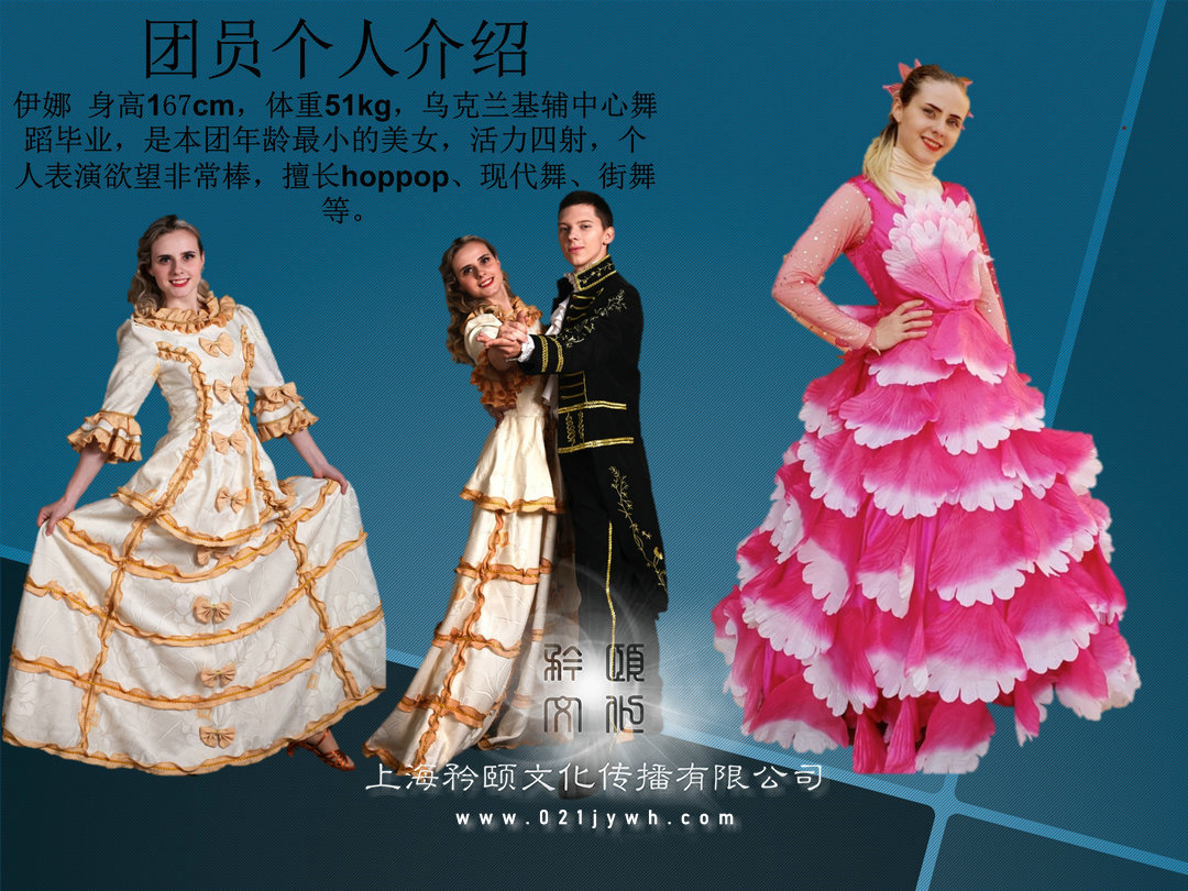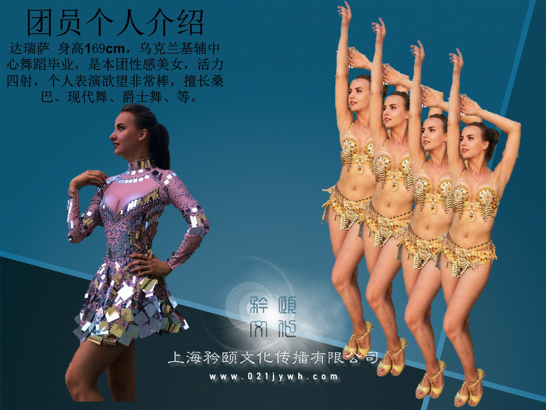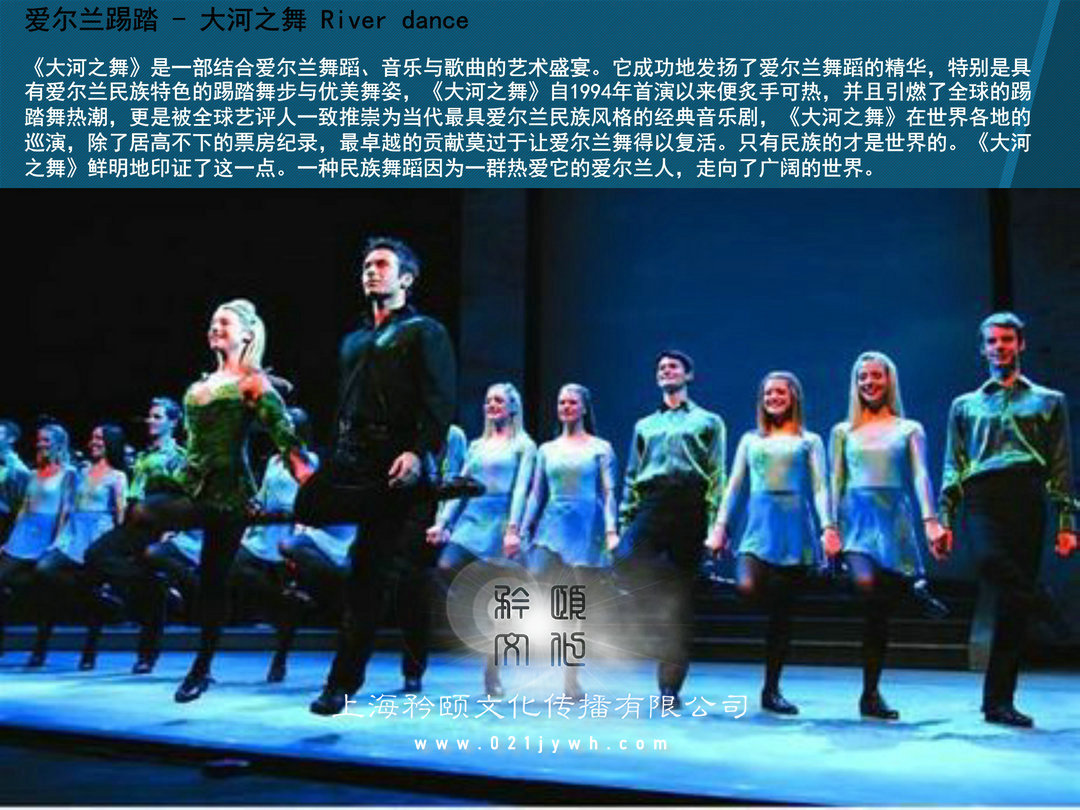 杰尼, 身高180cm, 烏克蘭專業舞蹈院校畢業, 老師、 舞編等, 獲得過多項國際舞蹈金獎, 在舞團內擔任領導職務。團員個人介紹安德森, 身高178cm, 烏克蘭舞蹈院校畢業,是本團最有活力的小伙, 多種舞種都會跳,尤其擅長hippop舞、 現代舞、 爵士舞等。團員個人介紹安塔莎, 身高168cm, 體重57kg烏克蘭舞蹈院校畢業, 是本團實力姑娘, 吃苦耐勞, 工作認真, 多種舞種都會跳, 擅長hippop舞、 現代舞、爵士舞等。團員個人介紹達瑞薩 身高169cm, 烏克蘭基輔中心舞蹈畢業, 是本團性感美女, 活力四射, 個人表演欲望非常棒, 擅長桑巴、 現代舞、 爵士舞、 等。團員個人介紹納塔麗 身高166cm, 體重55kg,烏克蘭基輔中心舞蹈畢業, 是本團熱辣美女, 動感活潑, 個人表演欲非常棒,擅長桑巴、 現代舞、 康康等多舞種演員。團員個人介紹句拉( julia) 身高168cm, 體重57kg,烏克蘭基輔中心舞蹈畢業, 嫵媚性感美女, 熱愛舞蹈, 從小就開始練習舞蹈, 舞蹈功底扎實, 擅長桑巴、 現代舞、 爵士舞、 俄羅斯民族舞等。團員個人介紹伊娜 身高167cm, 體重51kg, 烏克蘭基輔中心舞蹈畢業, 是本團年齡最小的美女, 活力四射, 個人表演欲望非常棒, 擅長hoppop、 現代舞、 街舞等?!?大河之舞》 是一部結合愛爾蘭舞蹈、 音樂與歌曲的藝術盛宴。 它成功地發揚了愛爾蘭舞蹈的精華, 特別是具有愛爾蘭民族特色的踢踏舞步與優美舞姿, 《 大河之舞》 自1994年首演以來便炙手可熱, 并且引燃了全球的踢踏舞熱潮, 更是被全球藝評人一致推崇為當代最具愛爾蘭民族風格的經典音樂劇, 《 大河之舞》 在世界各地的巡演, 除了居高不下的票房紀錄, 最卓越的貢獻莫過于讓愛爾蘭舞得以復活。 只有民族的才是世界的。 《 大河之舞》 鮮明地印證了這一點。 一種民族舞蹈因為一群熱愛它的愛爾蘭人, 走向了廣闊的世界。