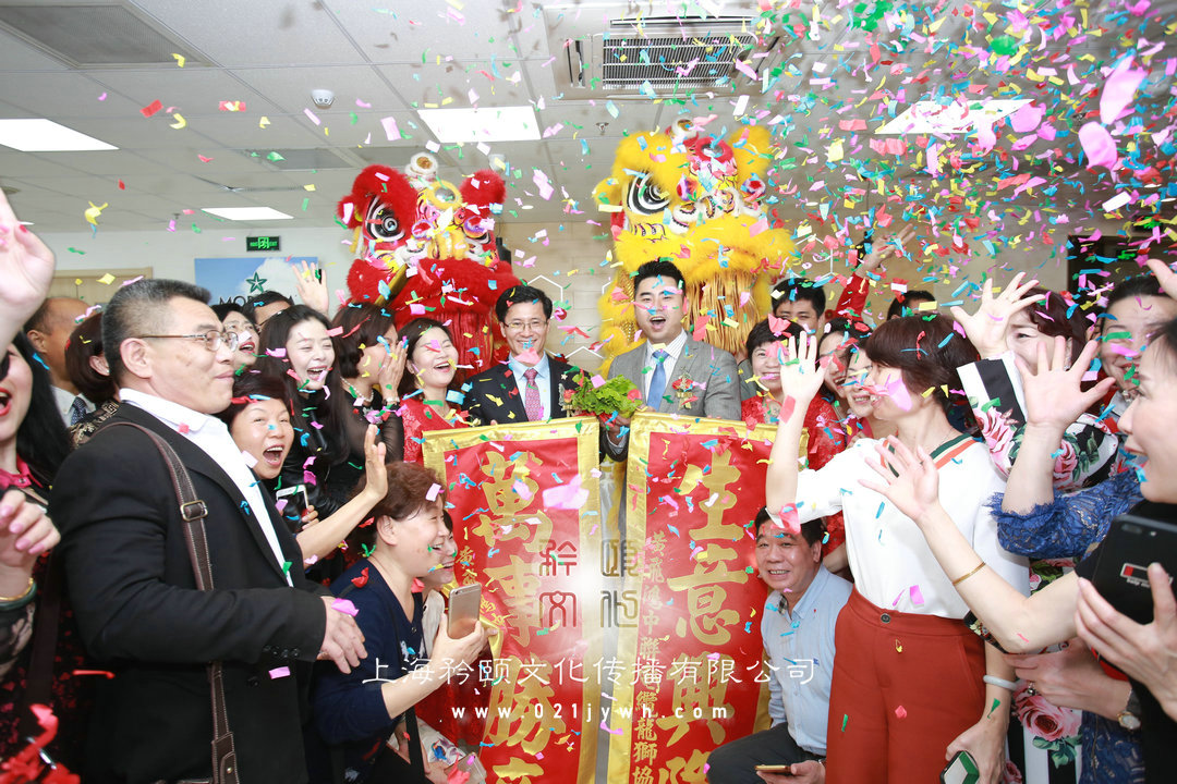 晚宴時間還不會被影響。這個是婚慶建議的時間,但就是我覺得,我不會在衤里面,而且和接下來的西式進場有點點衝突,所以我就選擇了第2個時間。2.帶領乳豬進場到我換好敬酒晚裝出來做結尾。帶乳準韭堂有熱.上海舞獅團隊,上海舞獅子隊因為畢音一道葜。