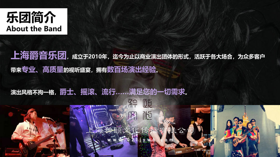 上海爵音樂團,成立于2010年,迄今為止以商業演出團體的形式,活躍于各大場合,為眾多客戶帶來專業、高質量的視聽盛宴,擁有數百場演出經驗。演出風格不拘一格,爵士、搖滾、流行……滿足您的一切需求。