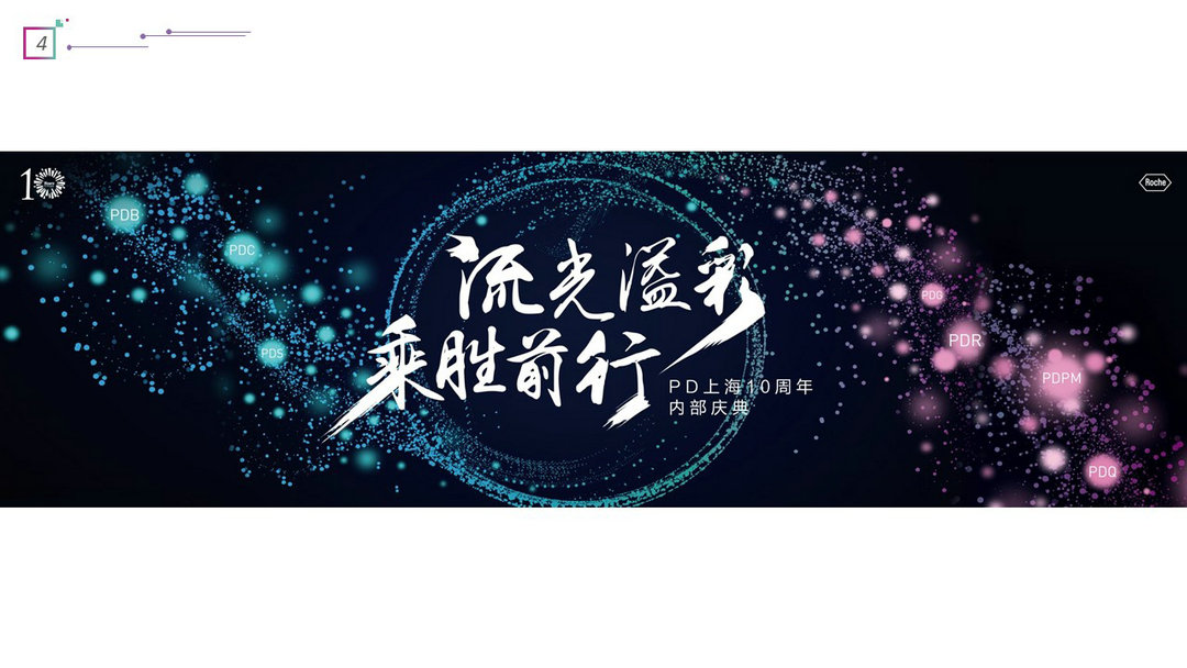 創意闡釋:七彩代表公司的七個部門,“十”速有兩層含義代表公司在中國走過里程碑式的十年;也同時是加號“十”加速把好藥帶到中國的公司使命。體現了公司部門的光彩榮耀,也傳達了公司速度。制作公司十周年大事回顧H5,展示公司 shanghai這十年來的精彩時刻,開啟十周年慶典預熱篇章。
