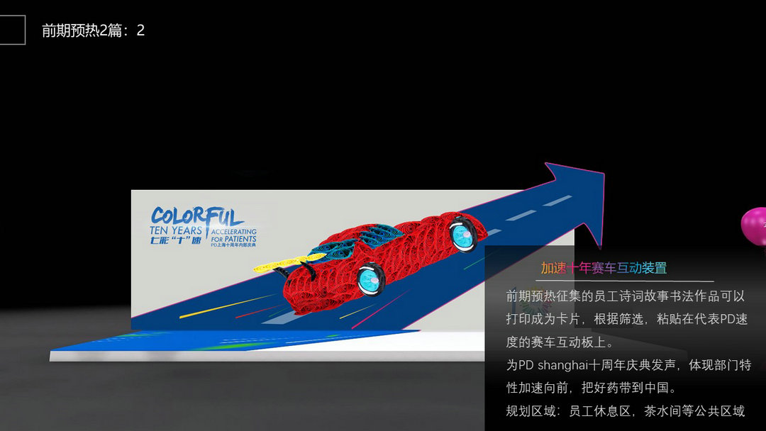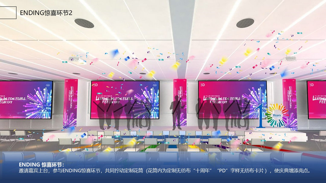 十年員工采訪(對未來工作的展望,寄語,以訪談形式進行),公司 shanghai 對未來的展望,一直以來保持的加速把好藥帶到中國,以加速疾步沖刺前行,為中國患者帶來的獲益(獲益照片視頻素材剪輯,),公司十年獲得的榮耀,獎項(簽約,協議,獲獎等照片),現場嘉賓在ending環節,通過手機發送祝福彈幕,至大屏幕,累積的每一條祝福都是為公司十周年慶典增添能量。直至祝福填滿整個能量環形,引爆“公司十周年內部慶典圓滿落幕”字樣。