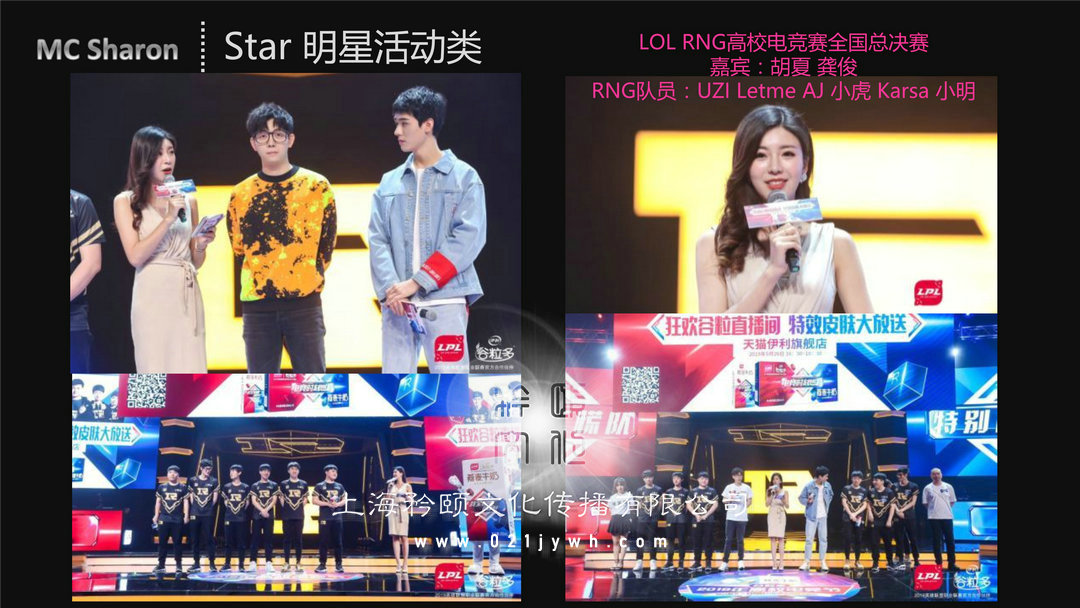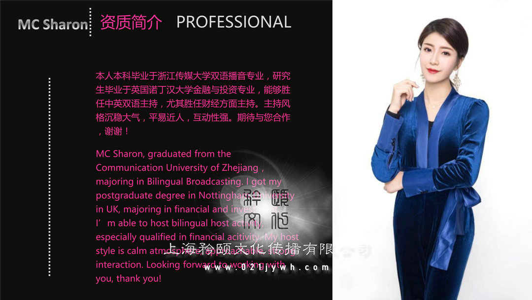 MC Sharon, graduated from theCommunication University of Zhejiang,majoring in Bilingual Broadcasting. I got mypostgraduate degree in Nottingham Universityin UK, majoring in financial and investment.
