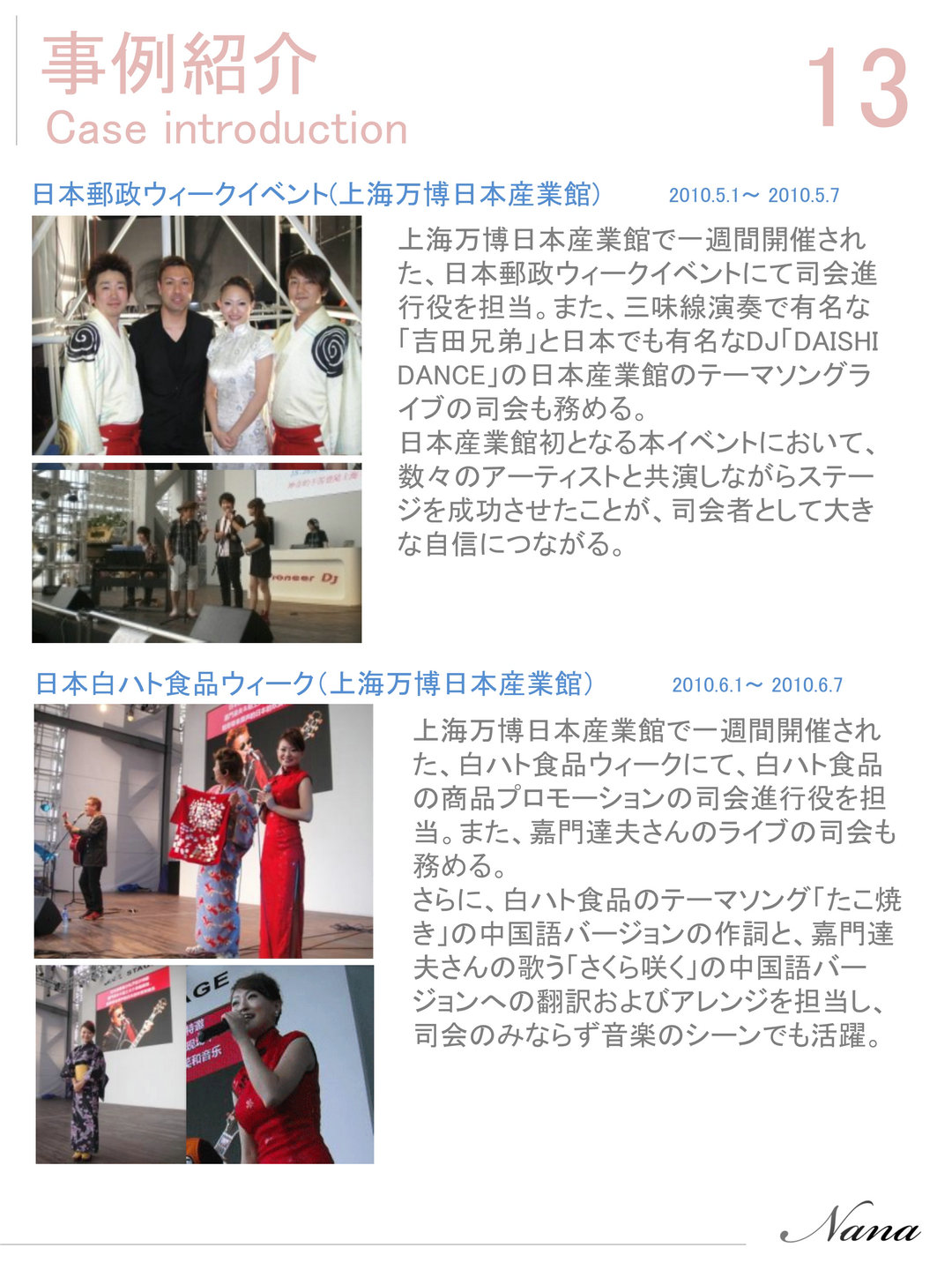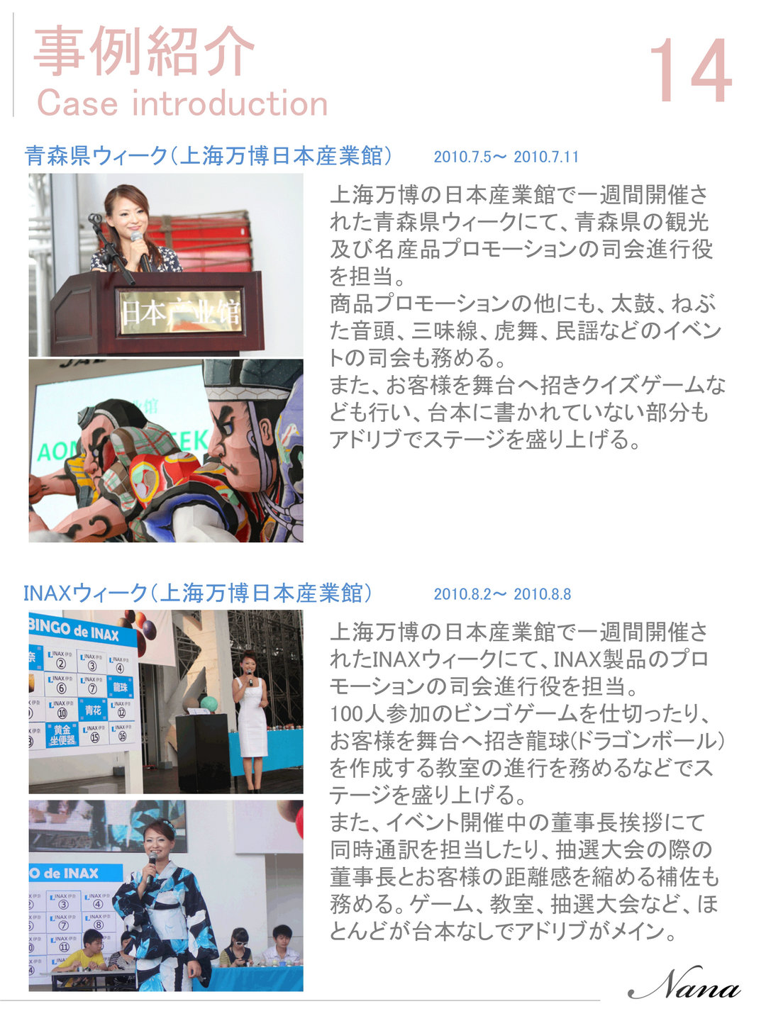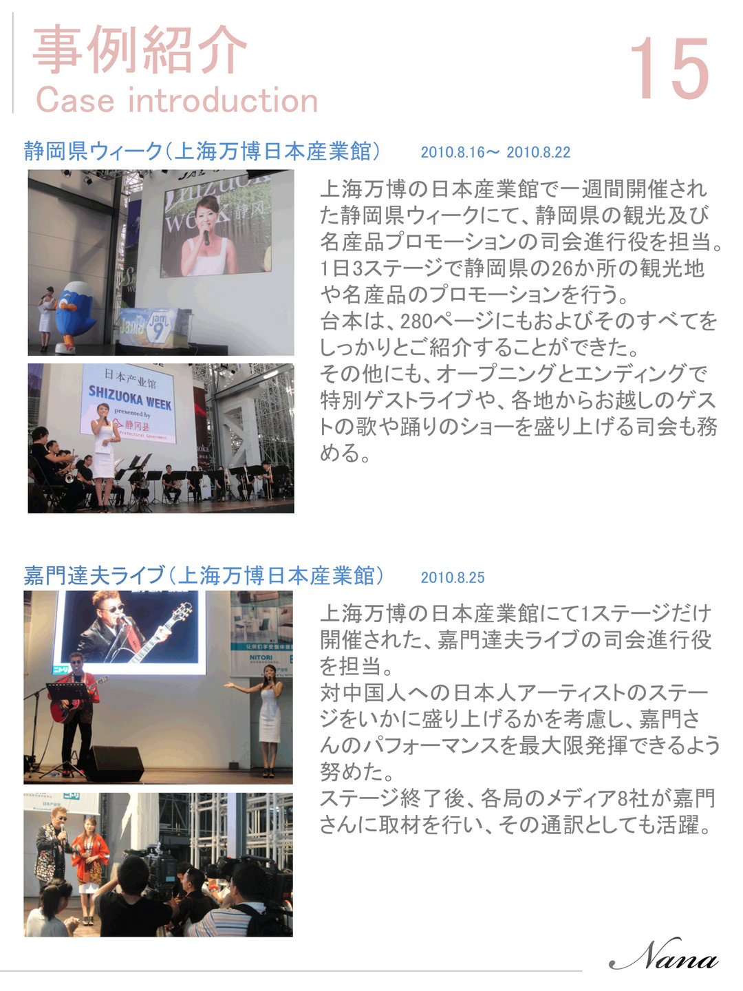上海萬博日本産業(yè)館で一週間開催された、白ハト食品ウィークにて、白ハト食品の商品プロモーションの司會(huì)進(jìn)行役を擔(dān)當(dāng)。また、嘉門達(dá)夫さんのライブの司會(huì)も務(wù)める。